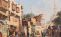 A sinistra, si notano edifici dalle facciate ornate con mashrabiya (tipici balconi lignei arabi), mentre sul fondo si staglia un elegante minareto che accentua la profondità prospettica. In primo piano, il brulicare di figure – mercanti, cammellieri, passanti – restituisce un’immagine viva e pulsante della città.