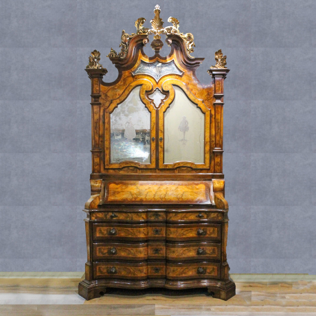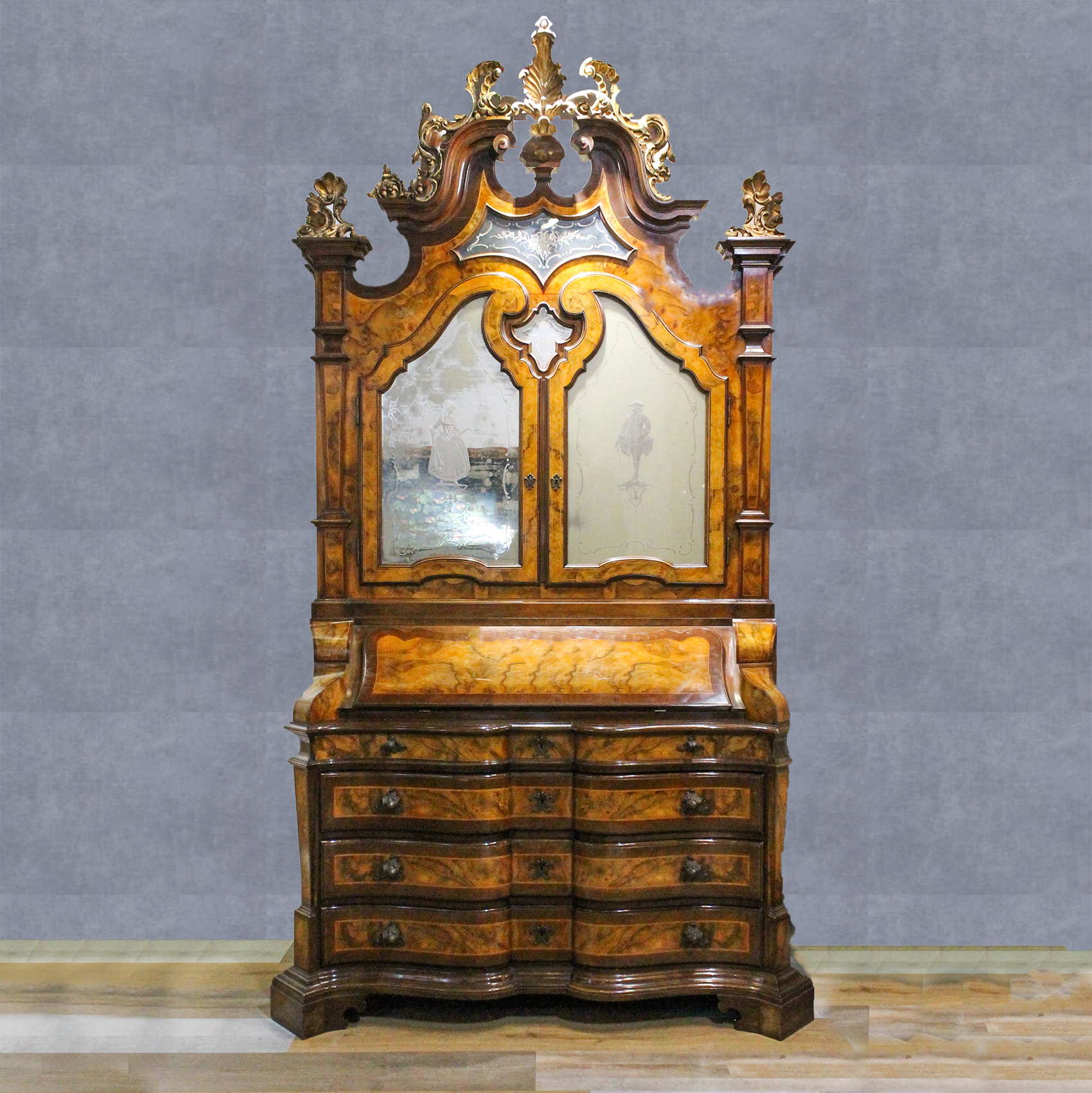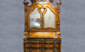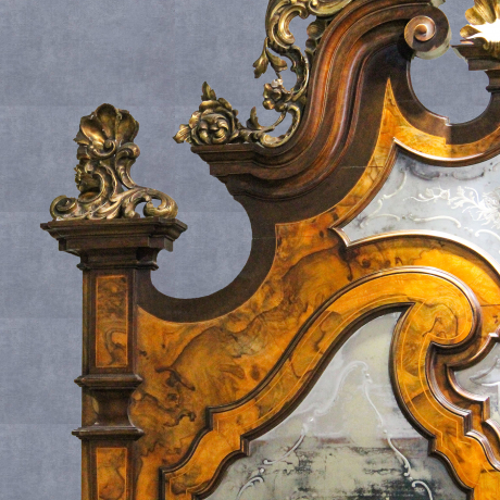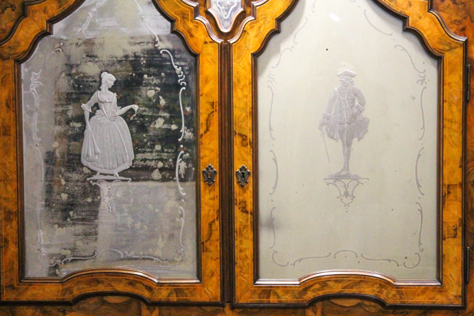 Trumeau in stile Veneto di recente produzione metà ‘900, cimasa in legno intagliato e dorato, vetri con disegni figura maschile e femminile, presenti 4 cassetti