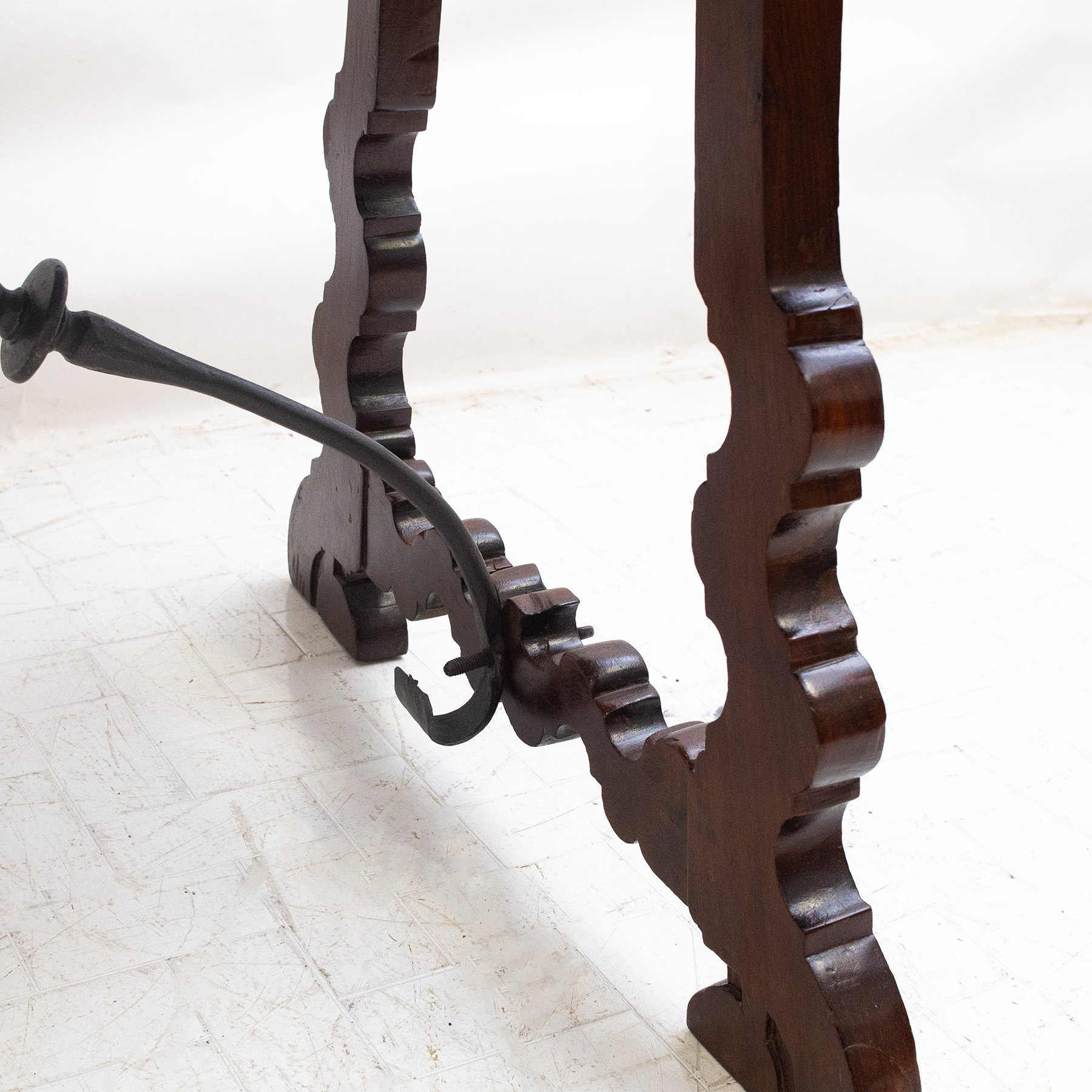 Antico tavolo fratino in noce con piano unico pezzo, gambe in mogano e base sagomata con croce in ferro battuto