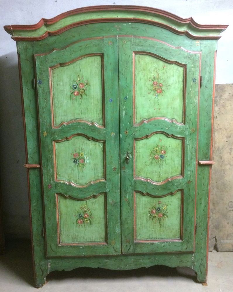 Armadio guardaroba piemontese in stile Luigi XV in gattice a due ante. Laccato, sui colori del verde, con pannelli decorati e bordature vinaccia. In buone condizioni.