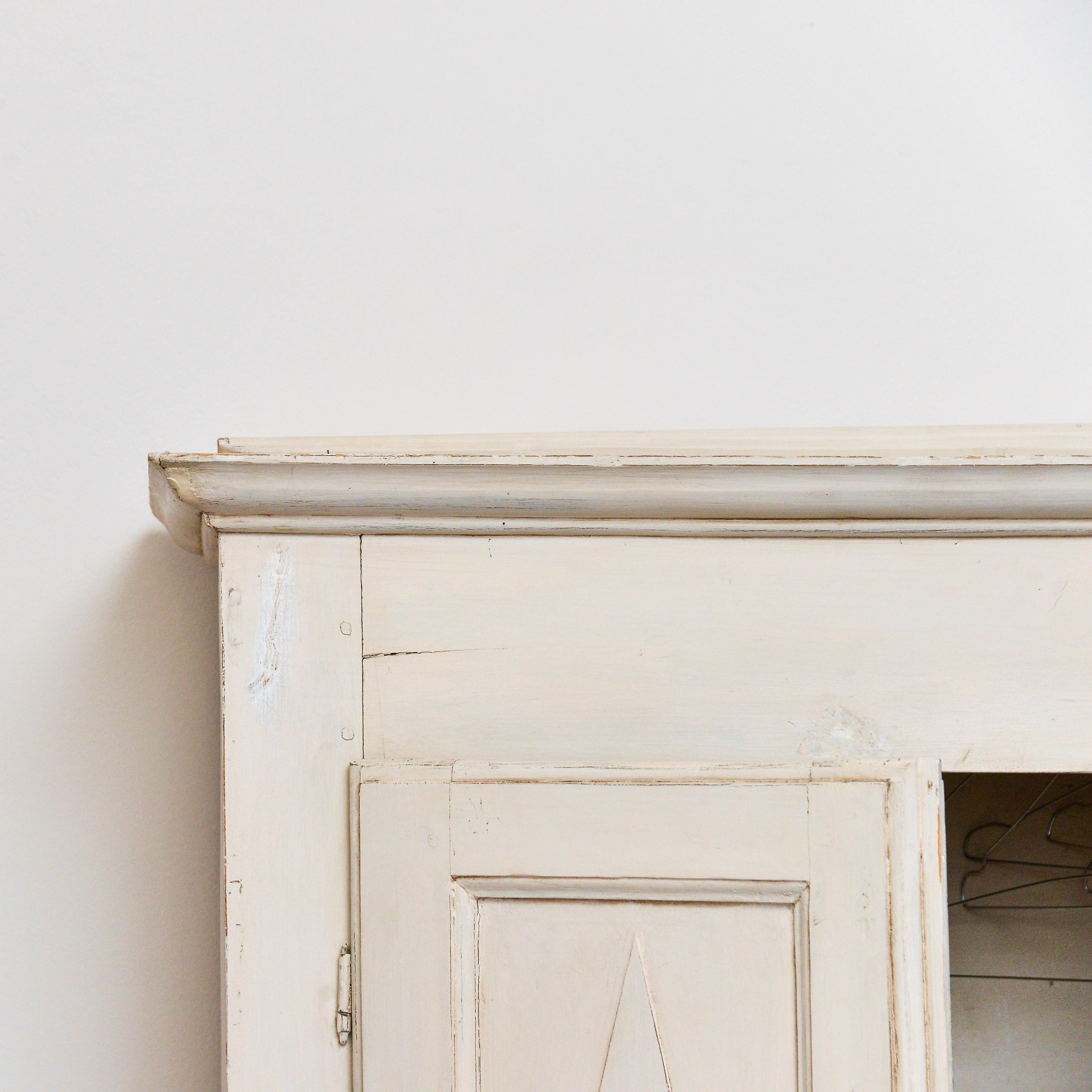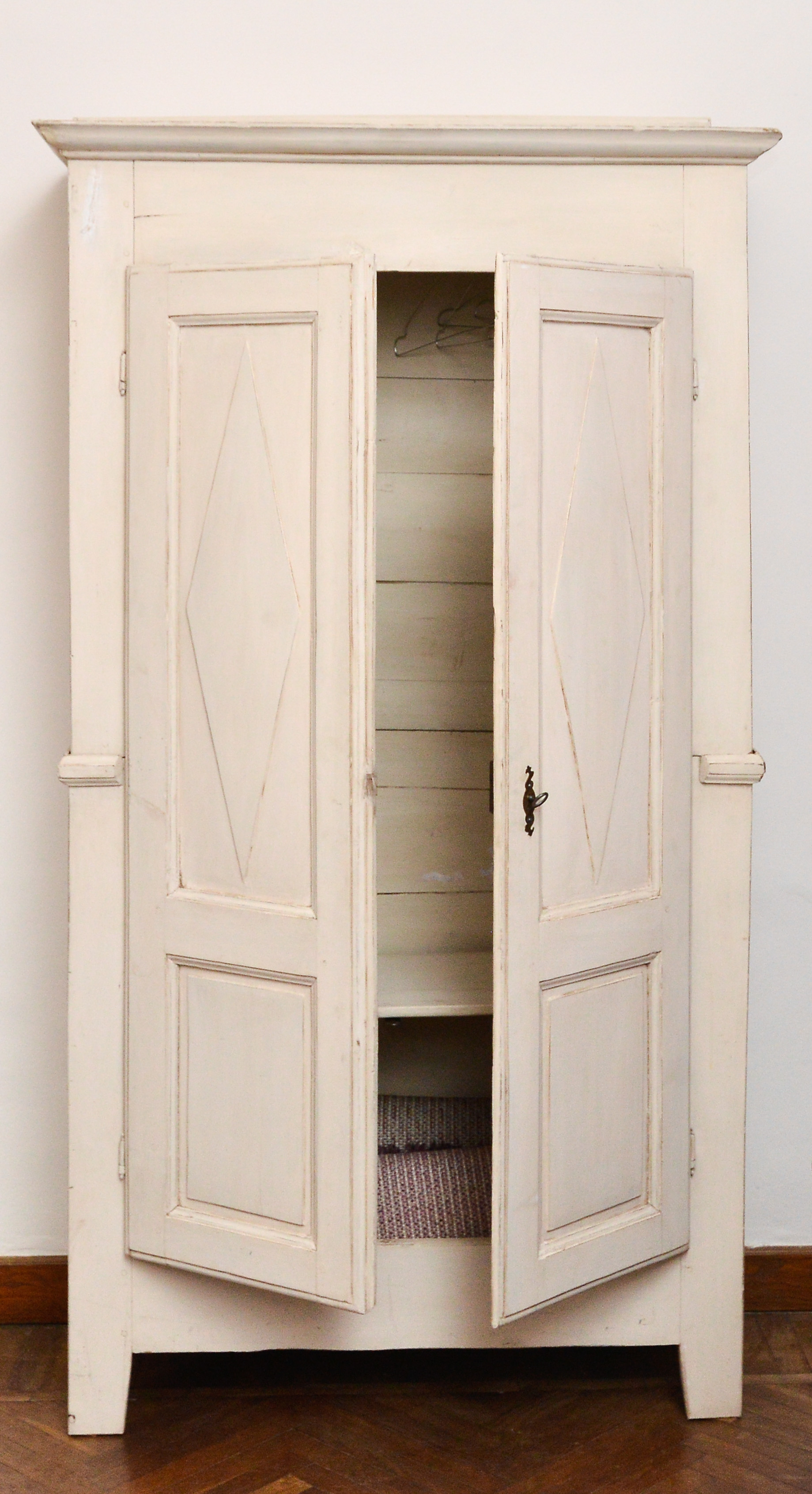 Armadietto piemontese in stile Impero, in pioppo, finitura provenzale, ante in battuta con rombi, struttura divisa in due corpi, risalente alla prima metà dell'800.