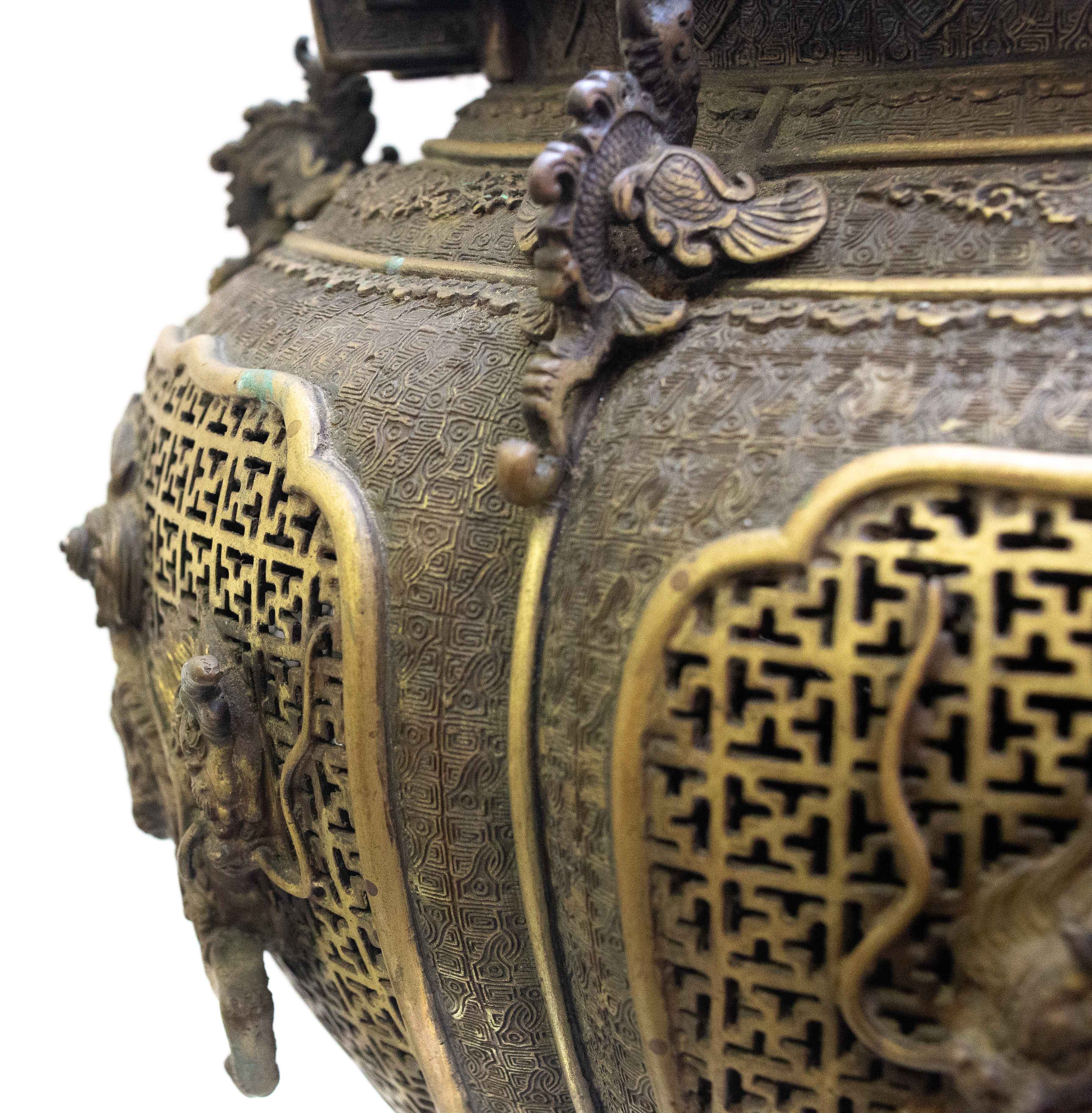 Bellissimo ed elegante incensiere origine Asia in bronzo dorato, reticolato con forme di Kirin modellate