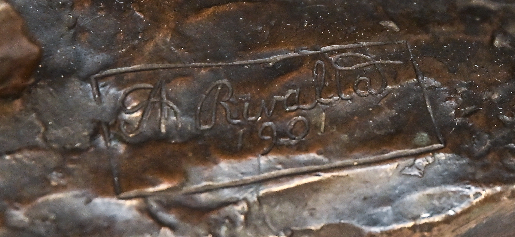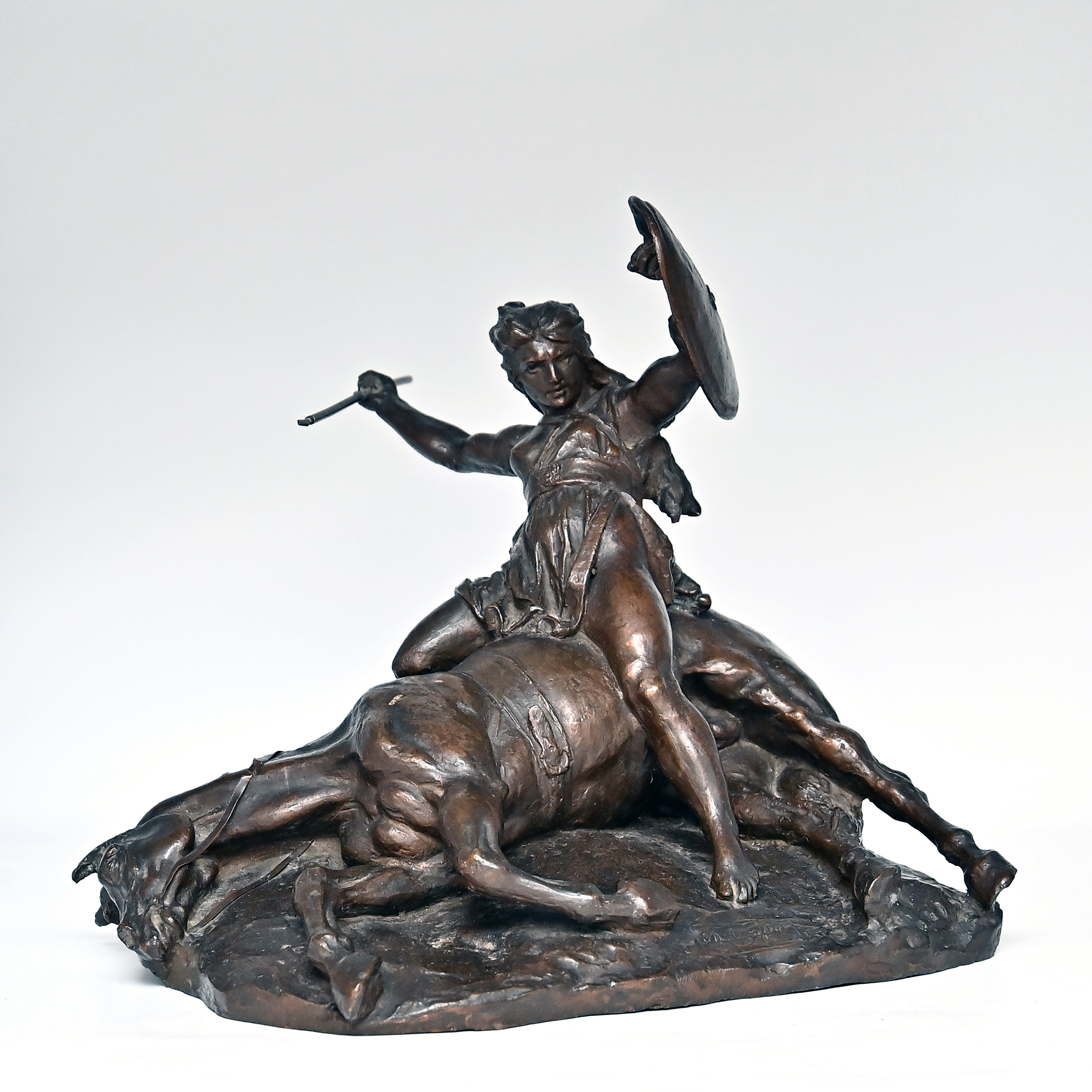 Questa magnifica scultura in bronzo, firmata e datata 1901 da Rivalta, raffigura un'Amazzone in combattimento, in una scena di grande impatto drammatico e dinamico.