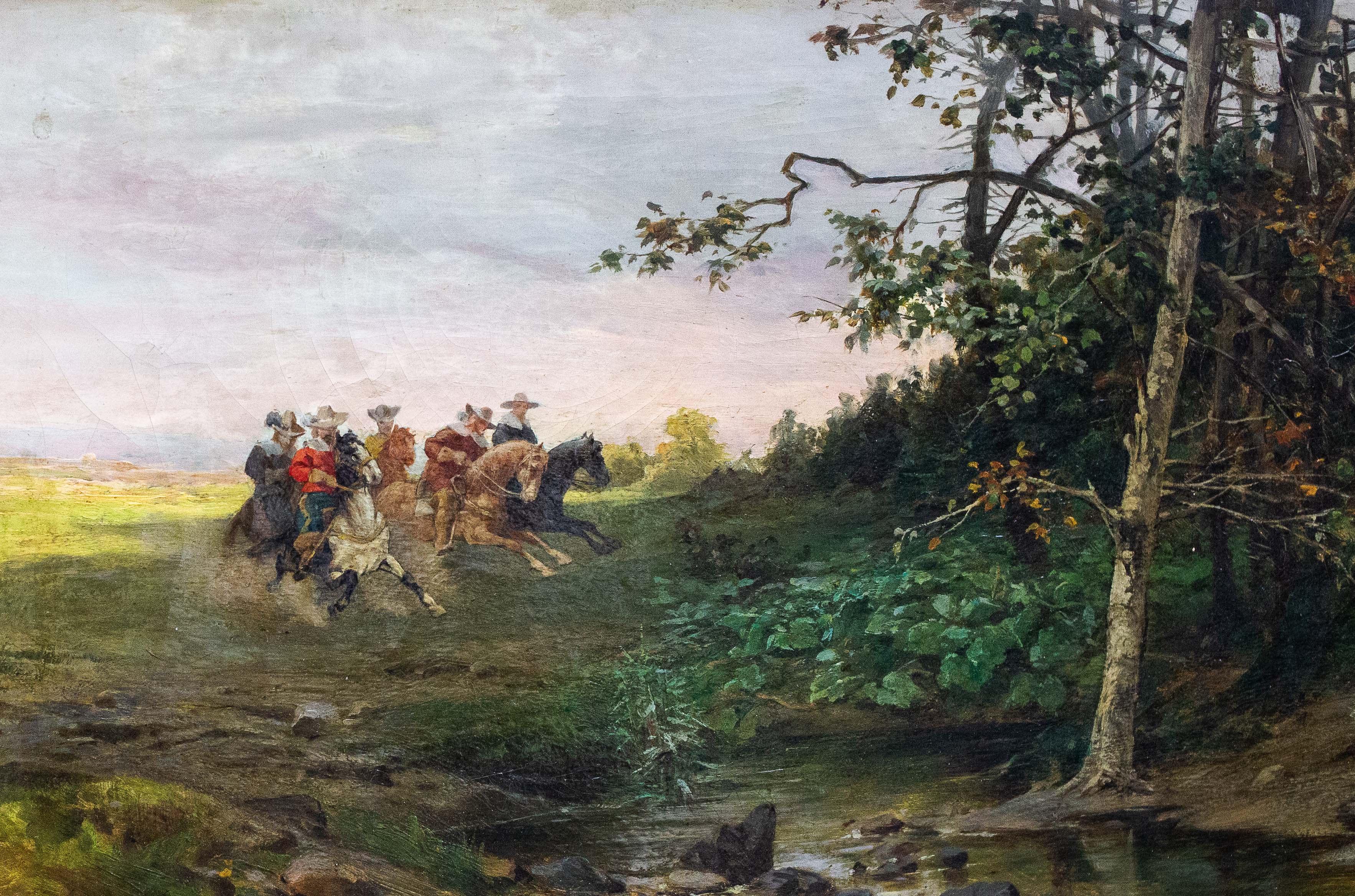 Il lato destro del dipinto è dominato dalla natura: un'area boschiva con alberi e vegetazione rigogliosa che si affaccia su un ruscello. L'acqua riflette il verde circostante e crea un'atmosfera tranquilla che contrasta con l'energia dei cavalieri. La luce del cielo, tenue e soffusa, contribuisce a un'atmosfera pacata e bilanciata.