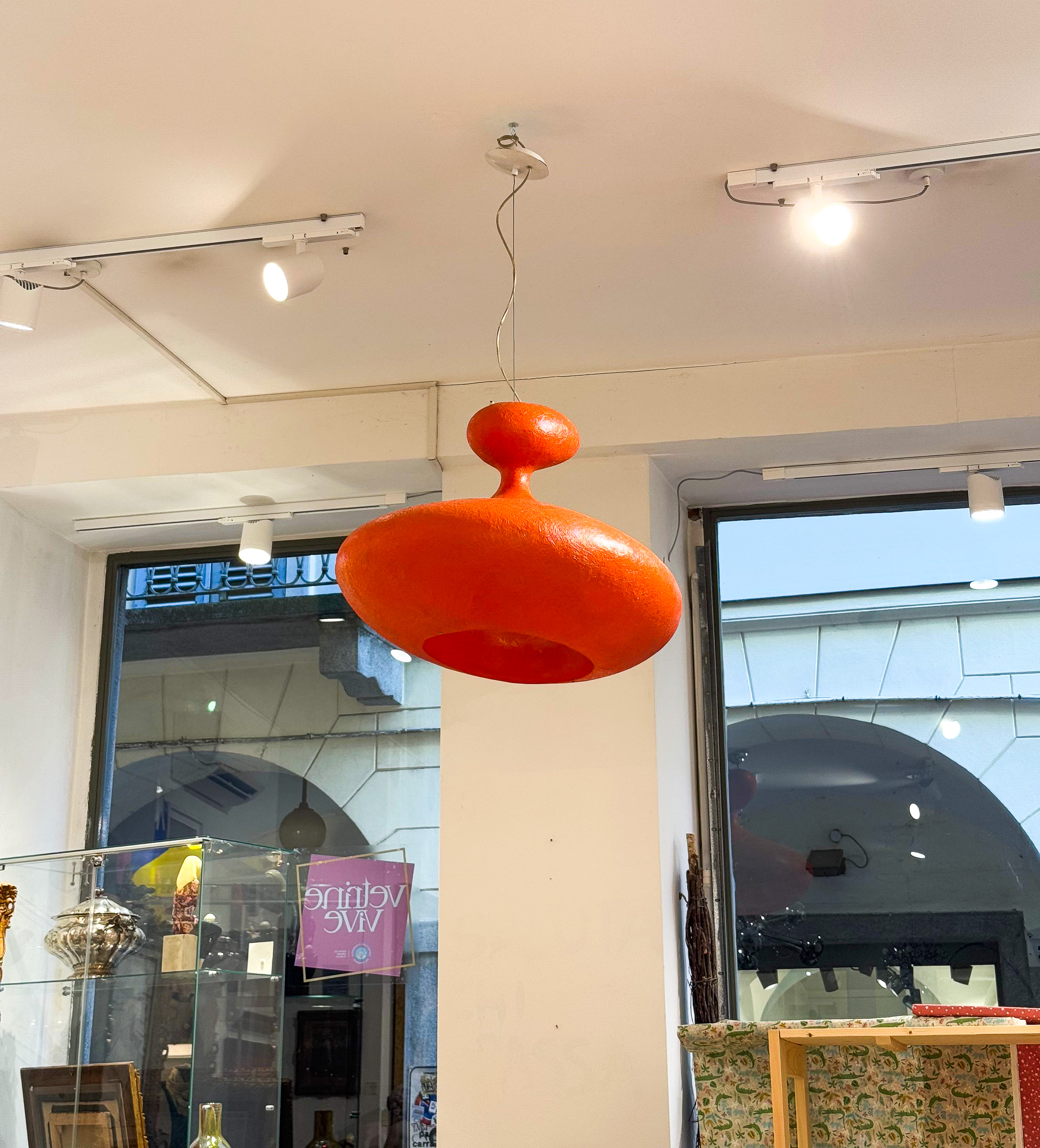 Lampadario ETA di Guglielmo Berchicci per Kundalini. Struttura in fibra di carbonio arancione.