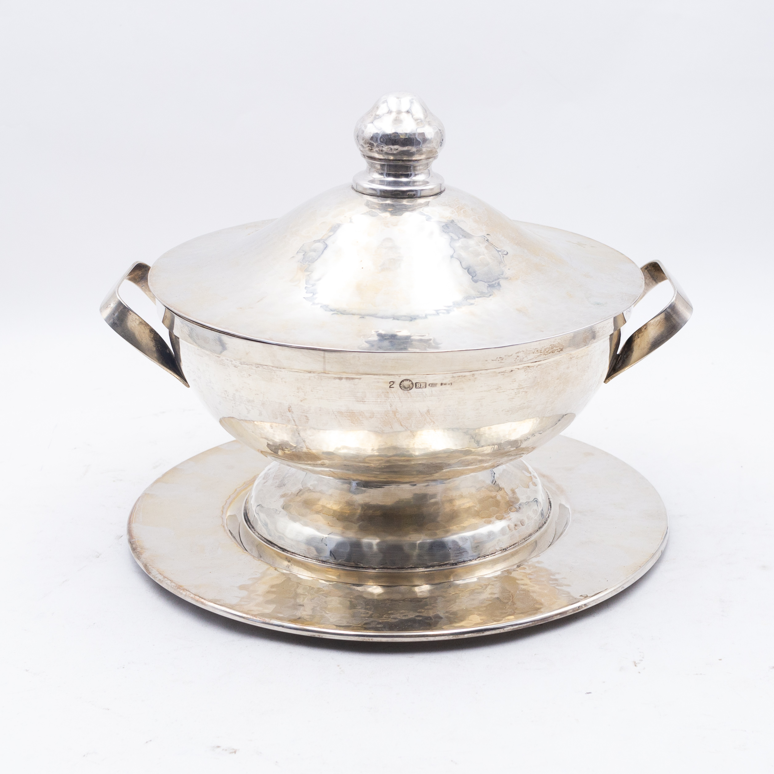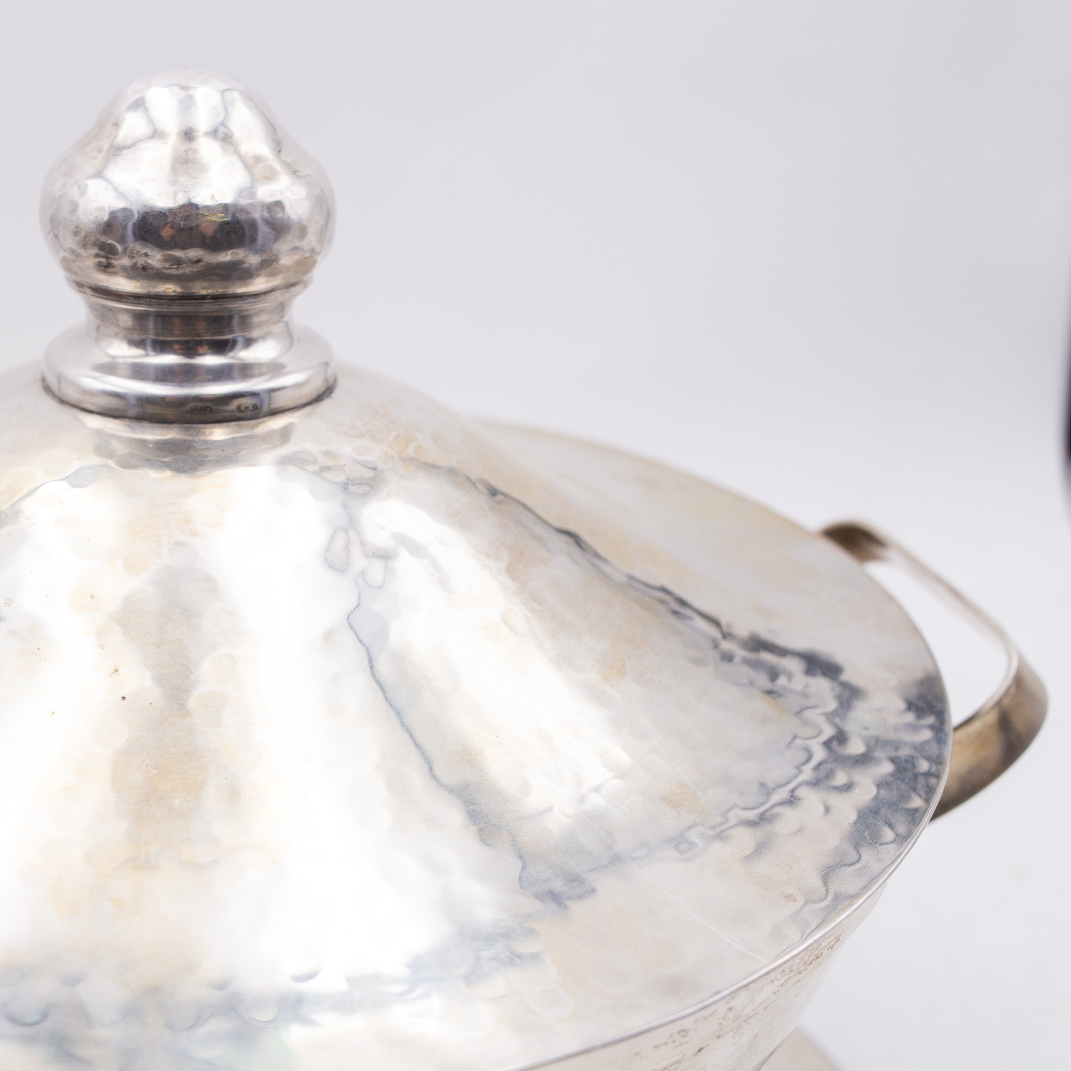 Zuppiera biansata in argento martellato, presa del coperchio tornita
