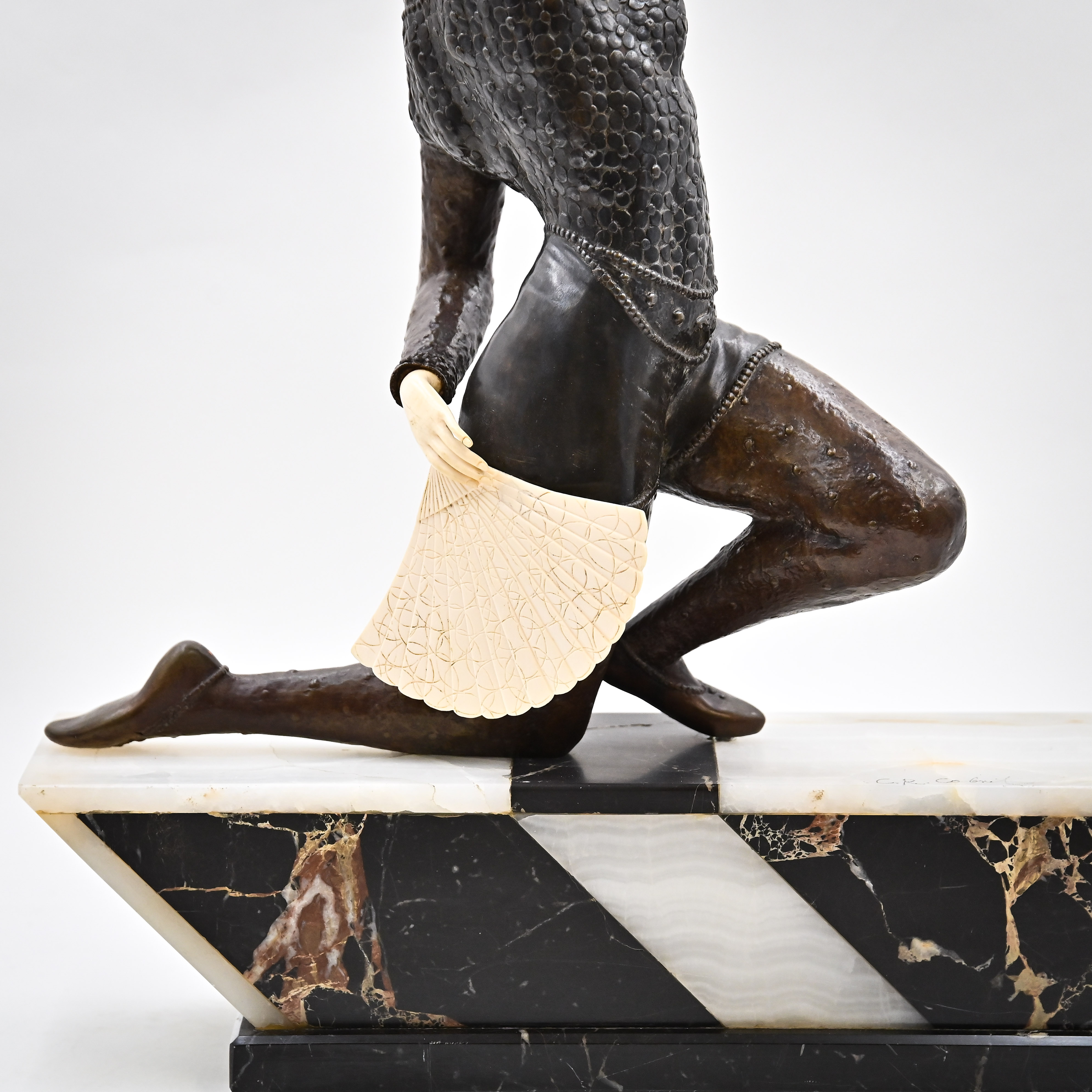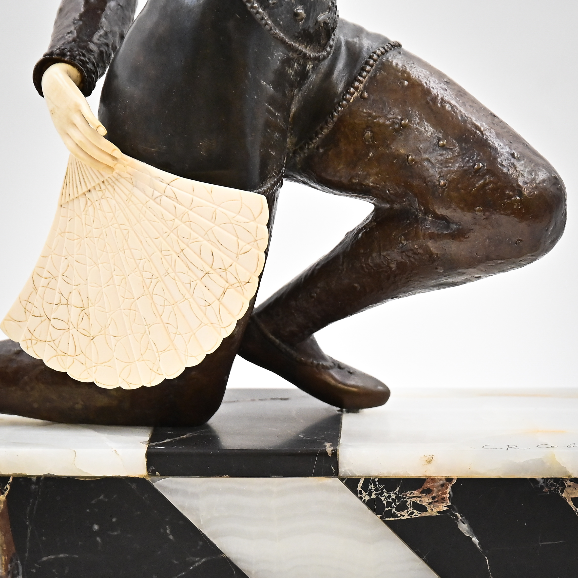 Scultura francese Art Déco in bronzo, poggiante su una base di Marmo Noir Saint Laurent e Onice. Opera firmata sulla base risalente agli anni '30.