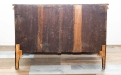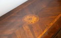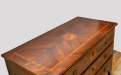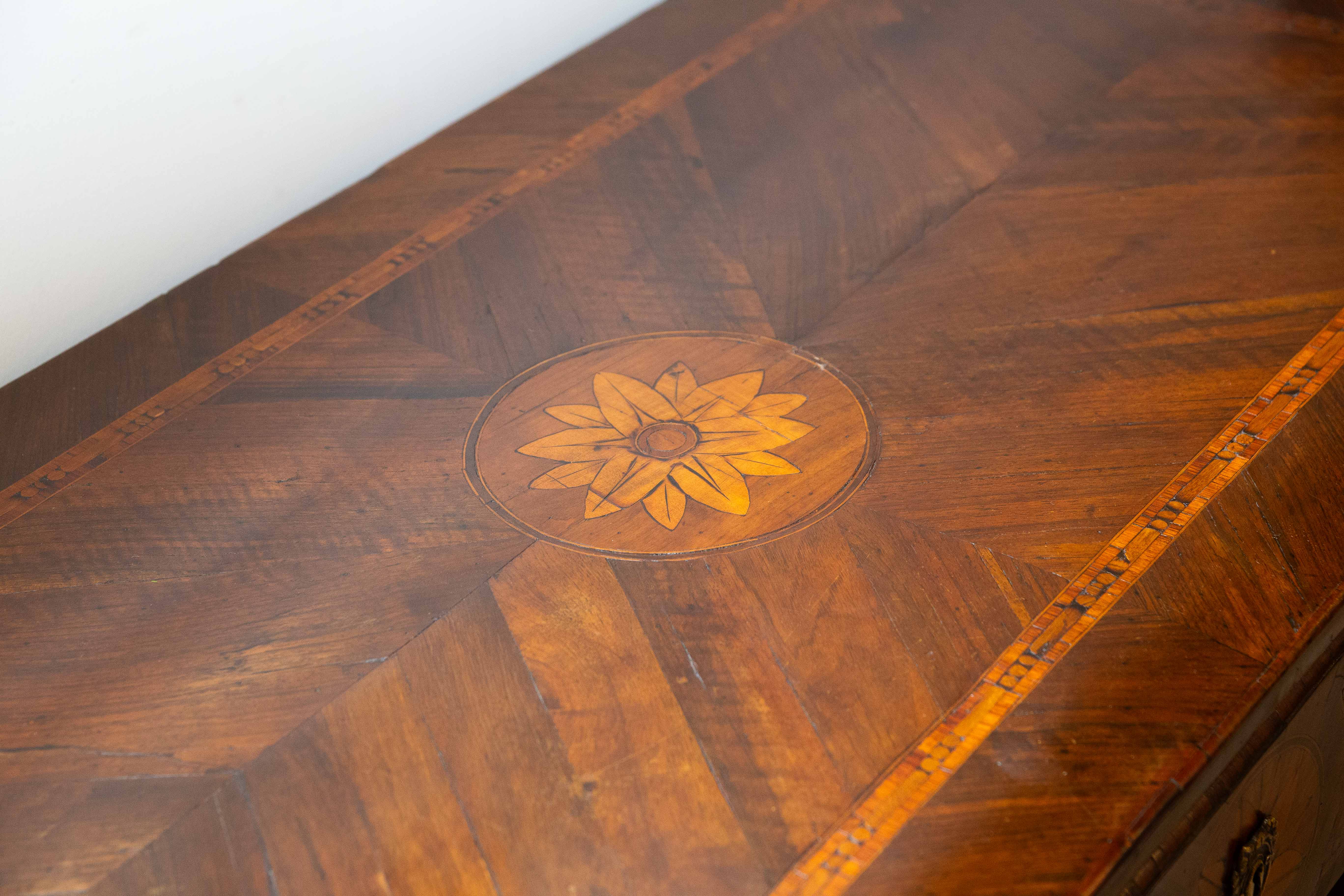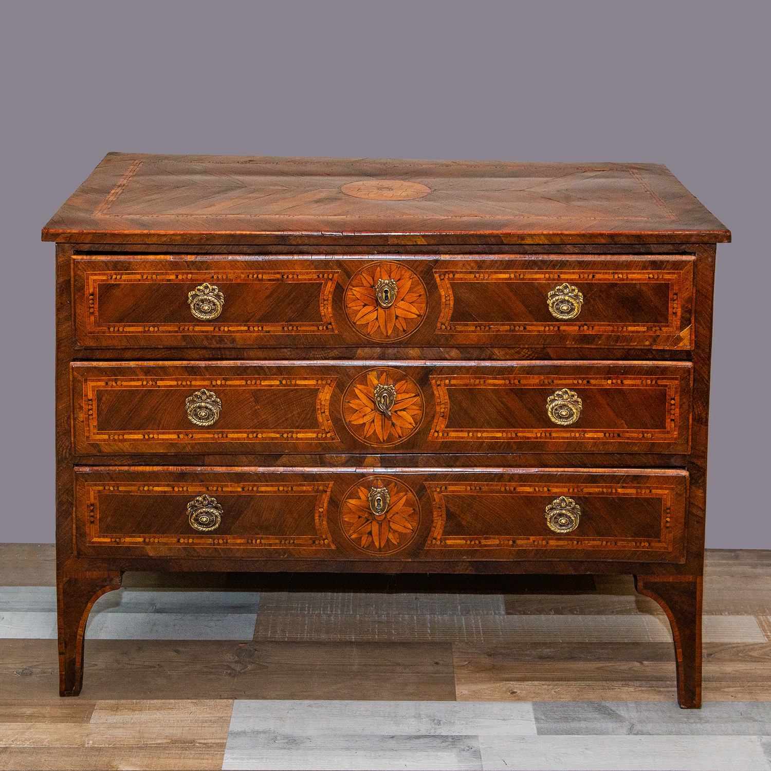 Il fronte è scandito da tre ampi cassetti, ciascuno ornato da raffinati motivi a marqueterie con medaglioni centrali a rosetta, che creano un elegante ritmo compositivo. Il piano superiore presenta una decorazione a raggiera, elemento distintivo che esalta la profondità e la varietà cromatica dei legni utilizzati.