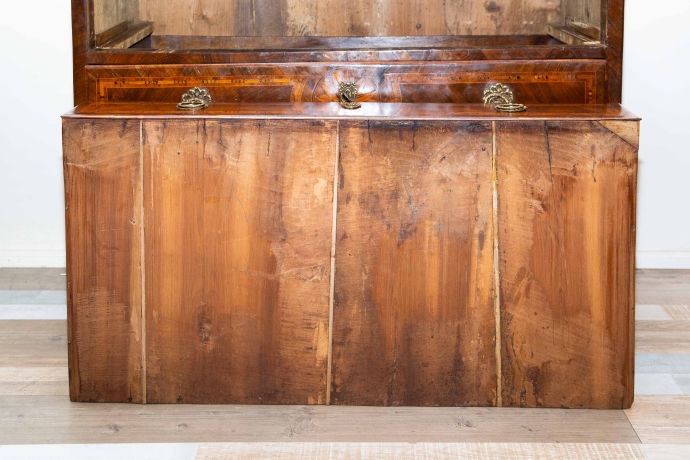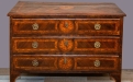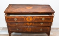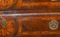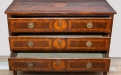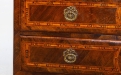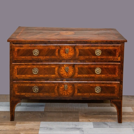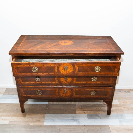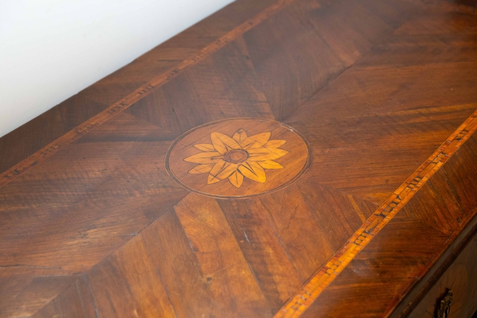 Elegante cassettone di manifattura piemontese del Settecento, espressione raffinata del gusto neoclassico diffuso sotto l’influenza dello stile Luigi XVI. La struttura, solida e armoniosa, è impreziosita da una ricca decorazione ad intarsio geometrico e floreale, realizzata con grande perizia artigianale in essenze pregiate.
