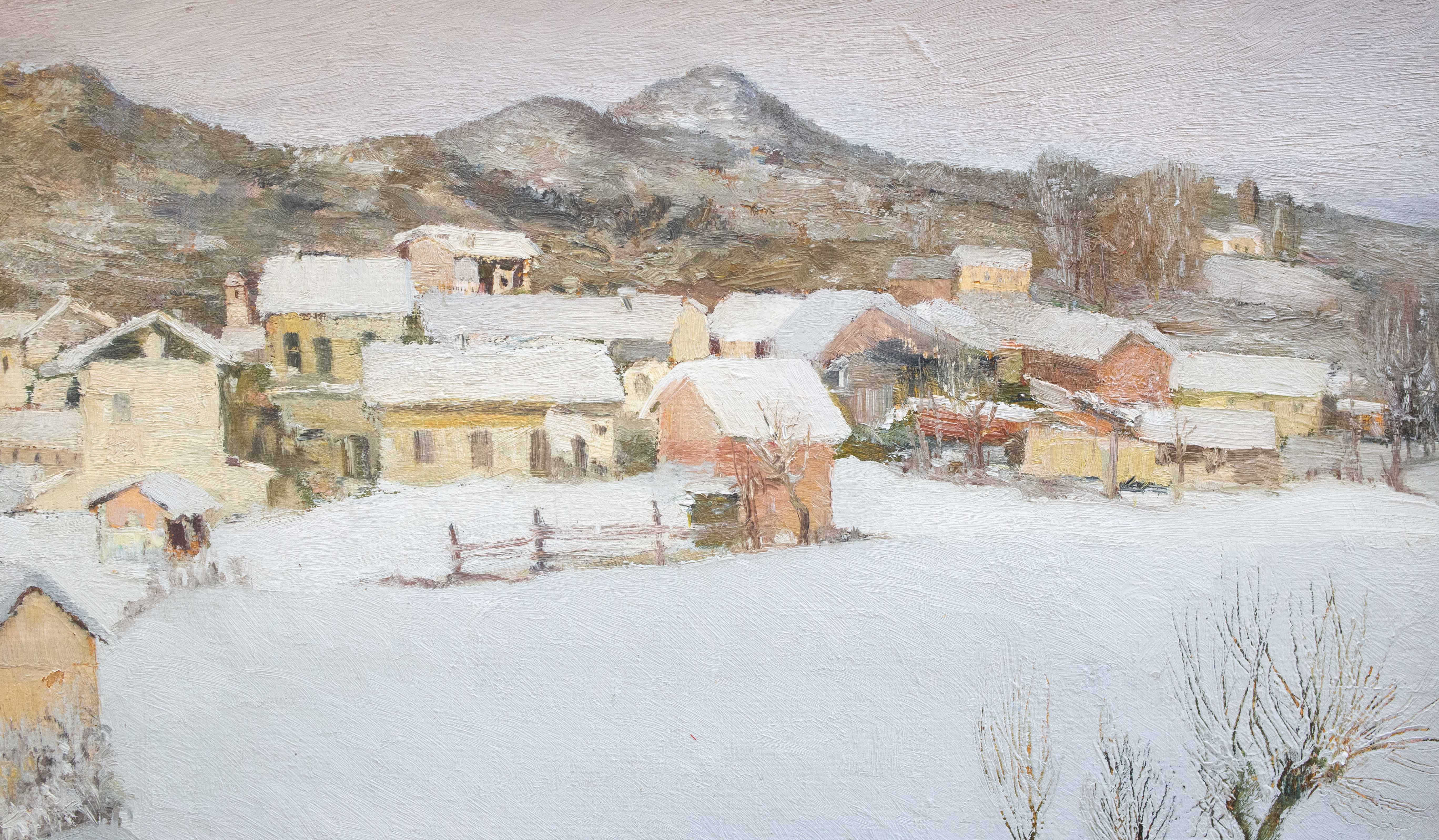 Bel dipinto di Celso Tempia, raffigurante paesaggio innevato, zona Prealpi Biellesi