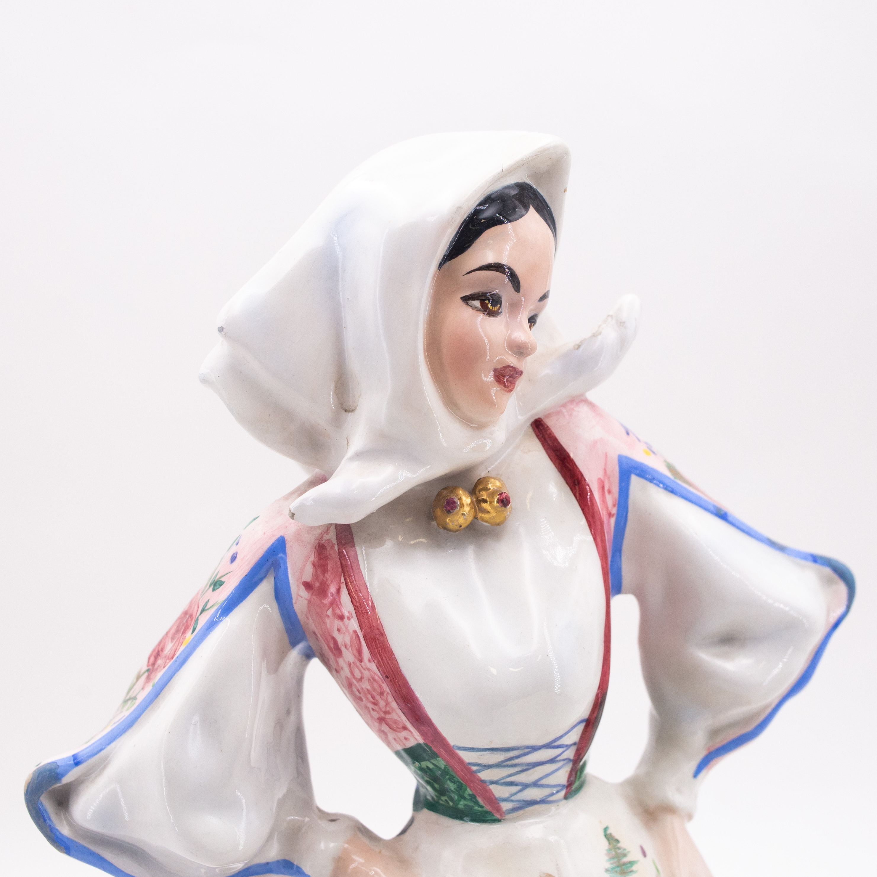 Scultura in ceramica smaltata e dipinta a mano dell'artista ceramista Alessandro Mola Jr., raffigurante donna con abito tipico di Sassari.
