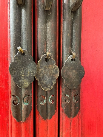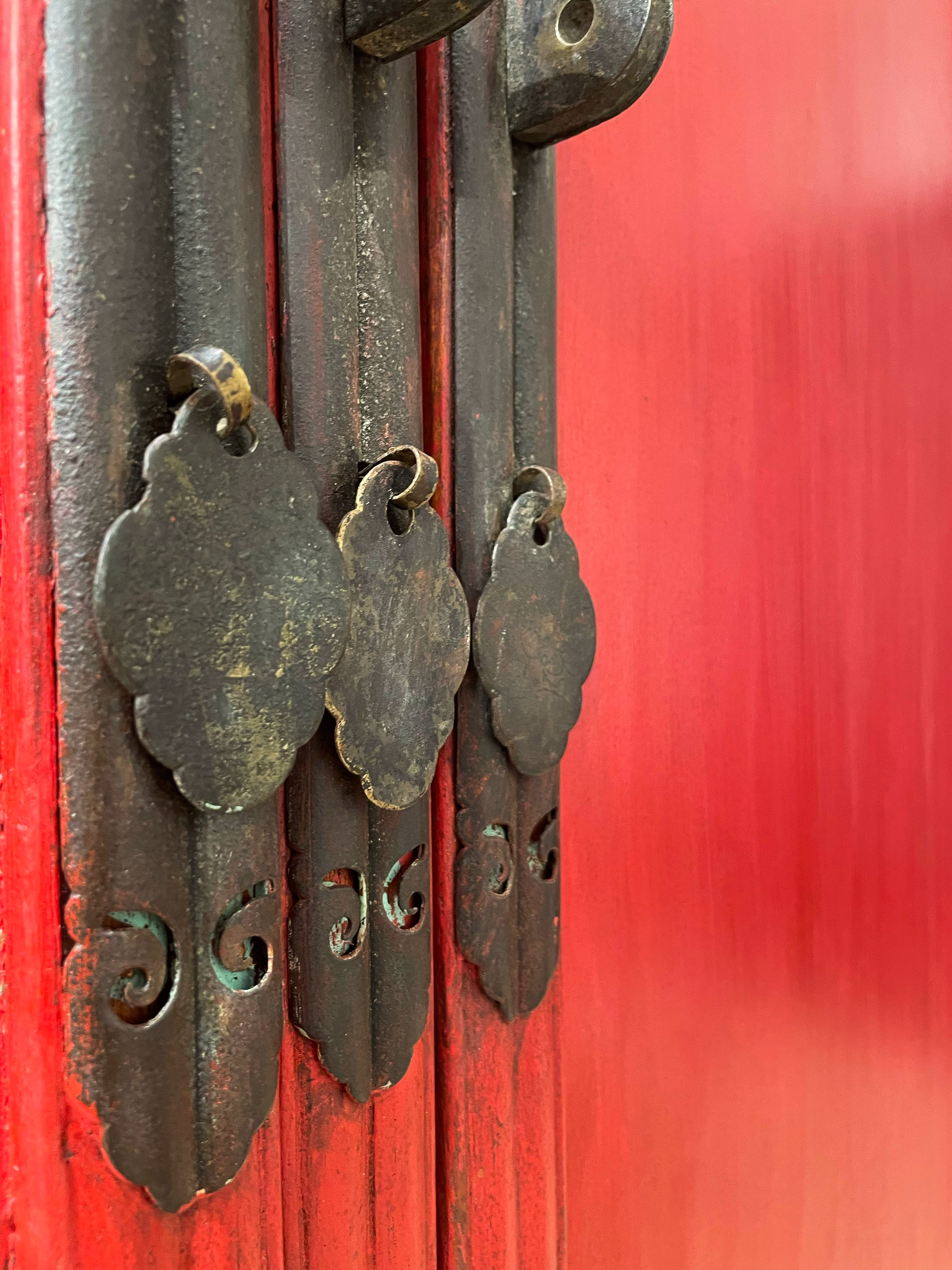 Elegante armadio cinese di inizio Novecento, realizzato in legno massello e laccato in un intenso rosso cinnabro, tipico della tradizione orientale. La superficie mostra una patina calda e vissuta, testimone del tempo, che arricchisce l’opera di fascino autentico.