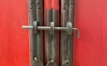 Il mobile è caratterizzato da linee essenziali, con cornici modanate che incorniciano i due sportelli frontali. La ferramenta centrale in ferro battuto, finemente lavorata e completa del tipico sistema di chiusura a perno, rappresenta un dettaglio decorativo e funzionale, perfettamente in linea con lo stile dell’epoca.