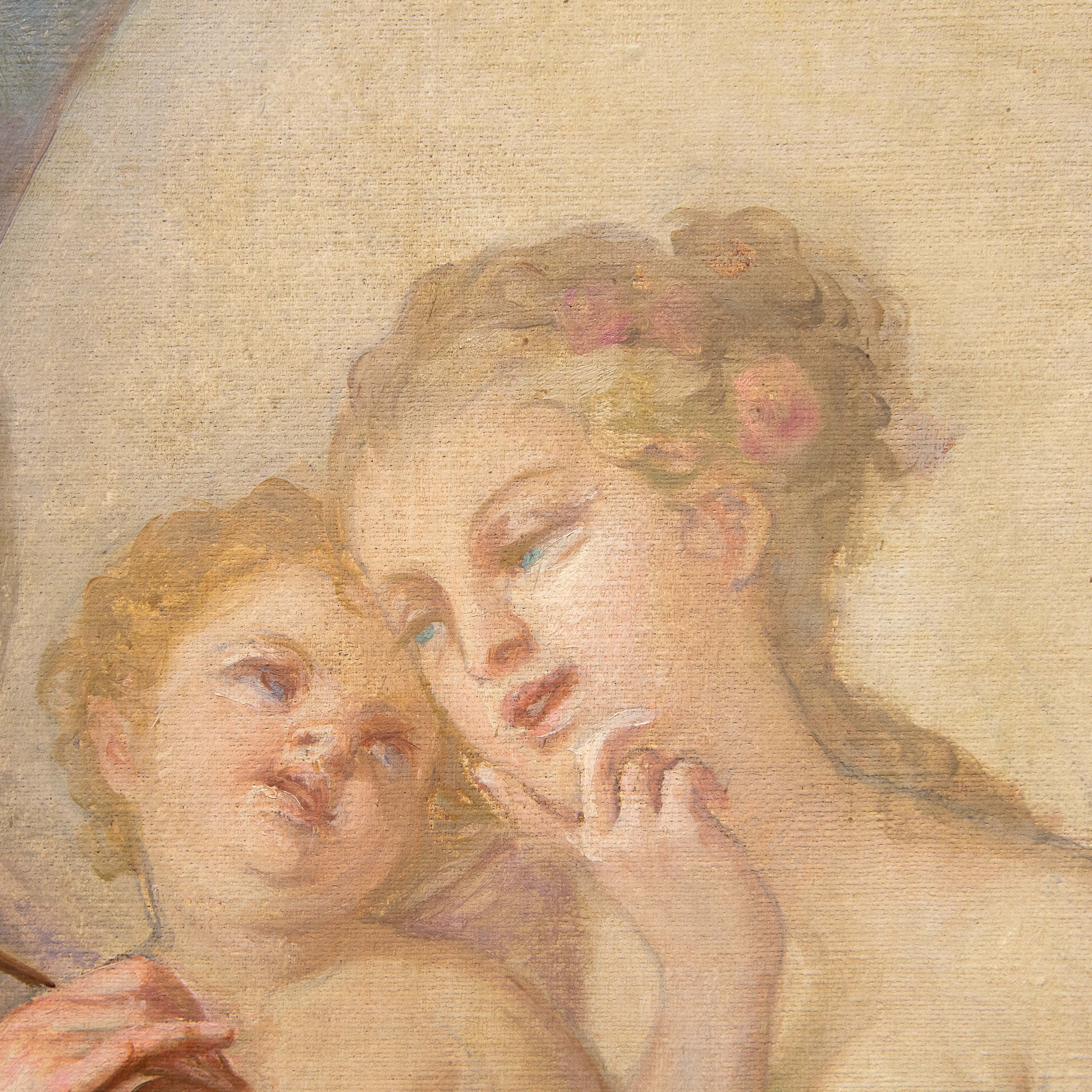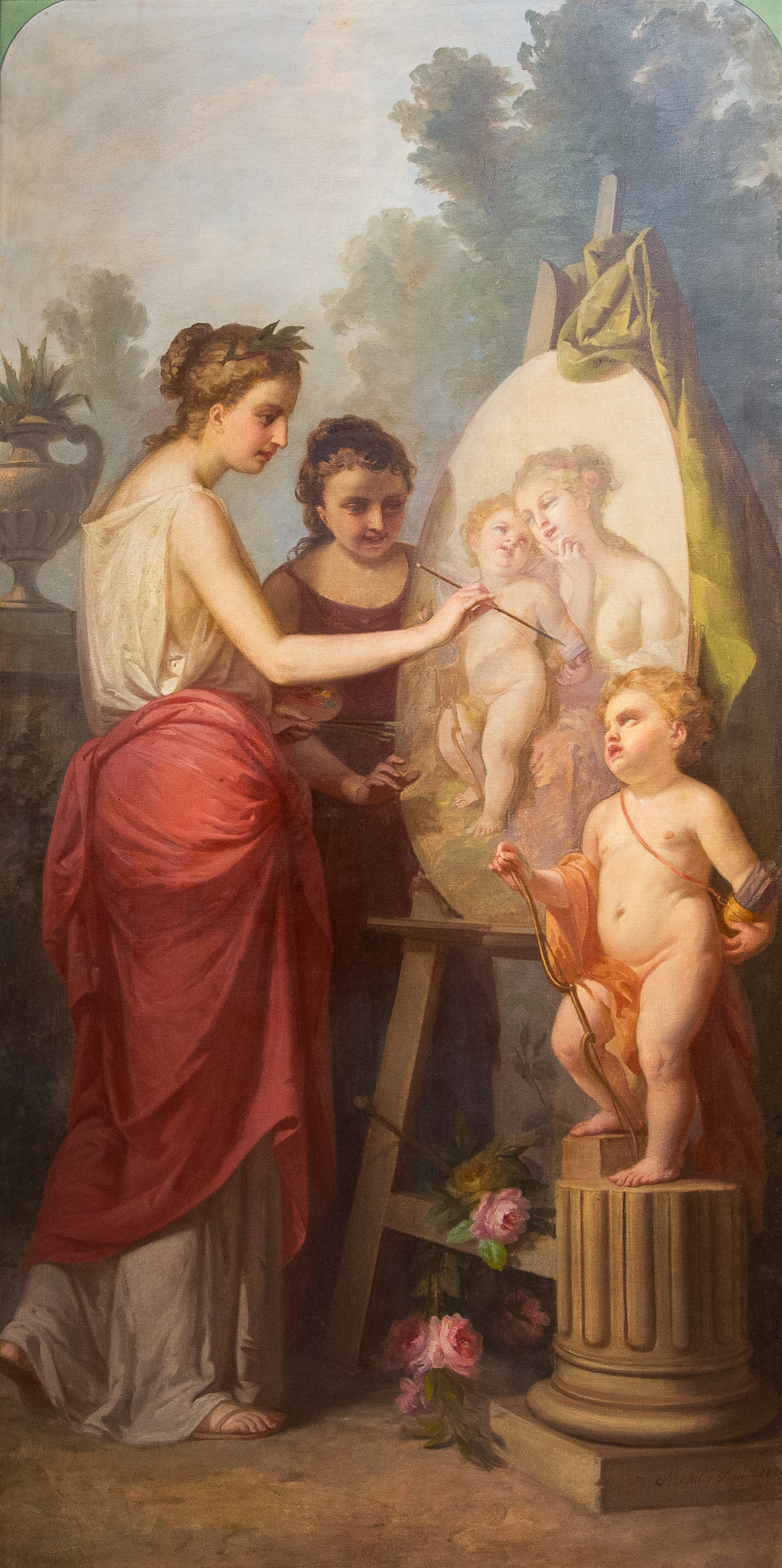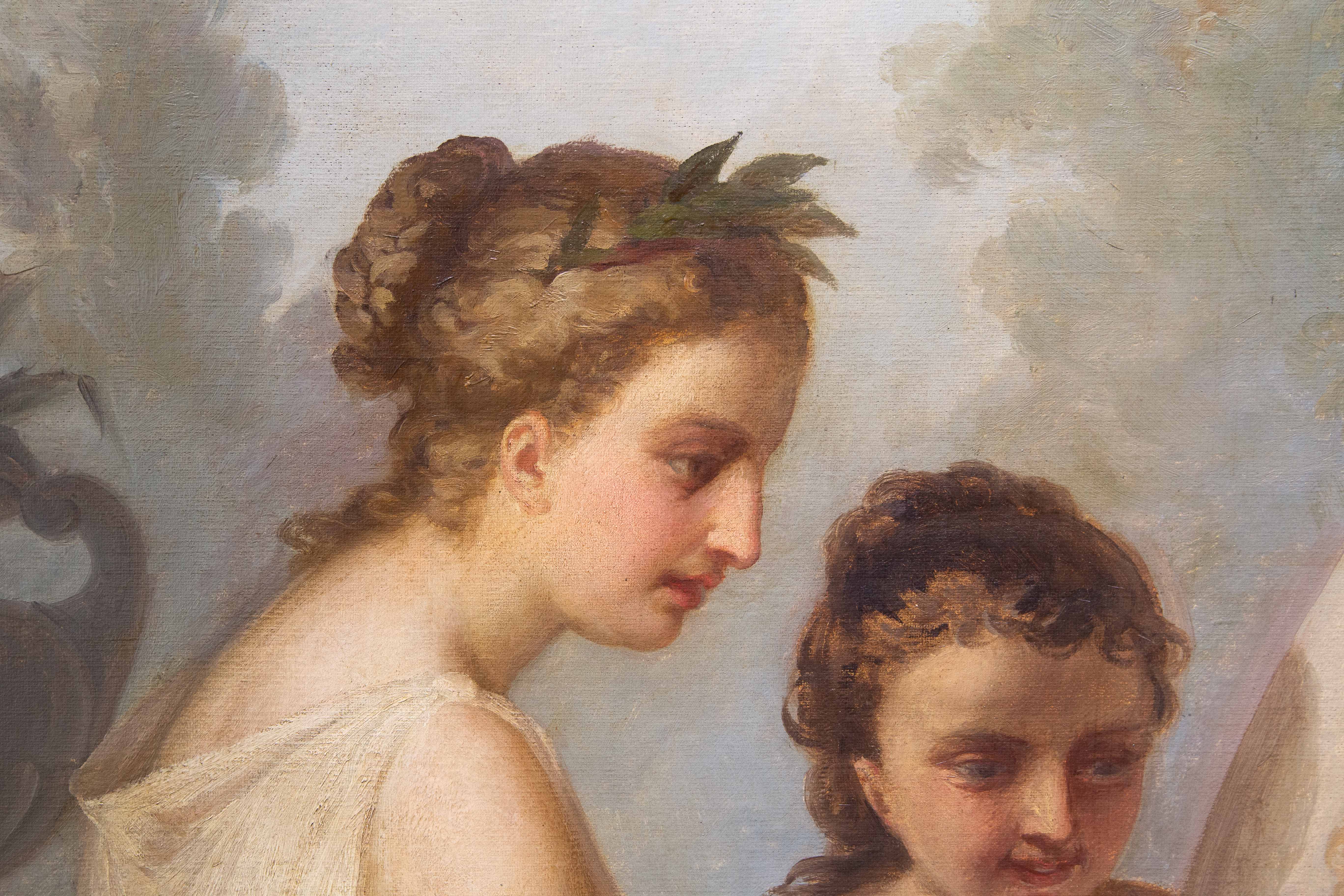 La Pittura, firmata e datata 1874, introduce il ciclo: una giovane artista, panneggiata in un ricco drappo rosso, è colta nell’atto di dipingere su cavalletto una scena di soggetto mitologico. Accanto a lei, una fanciulla osserva con attenzione, evocando il tema della trasmissione del sapere. Un putto, posto su un basamento, funge da modello vivente, mentre la resa luminosa e la cura dei dettagli floreali conferiscono alla scena un carattere intimo e colto.