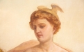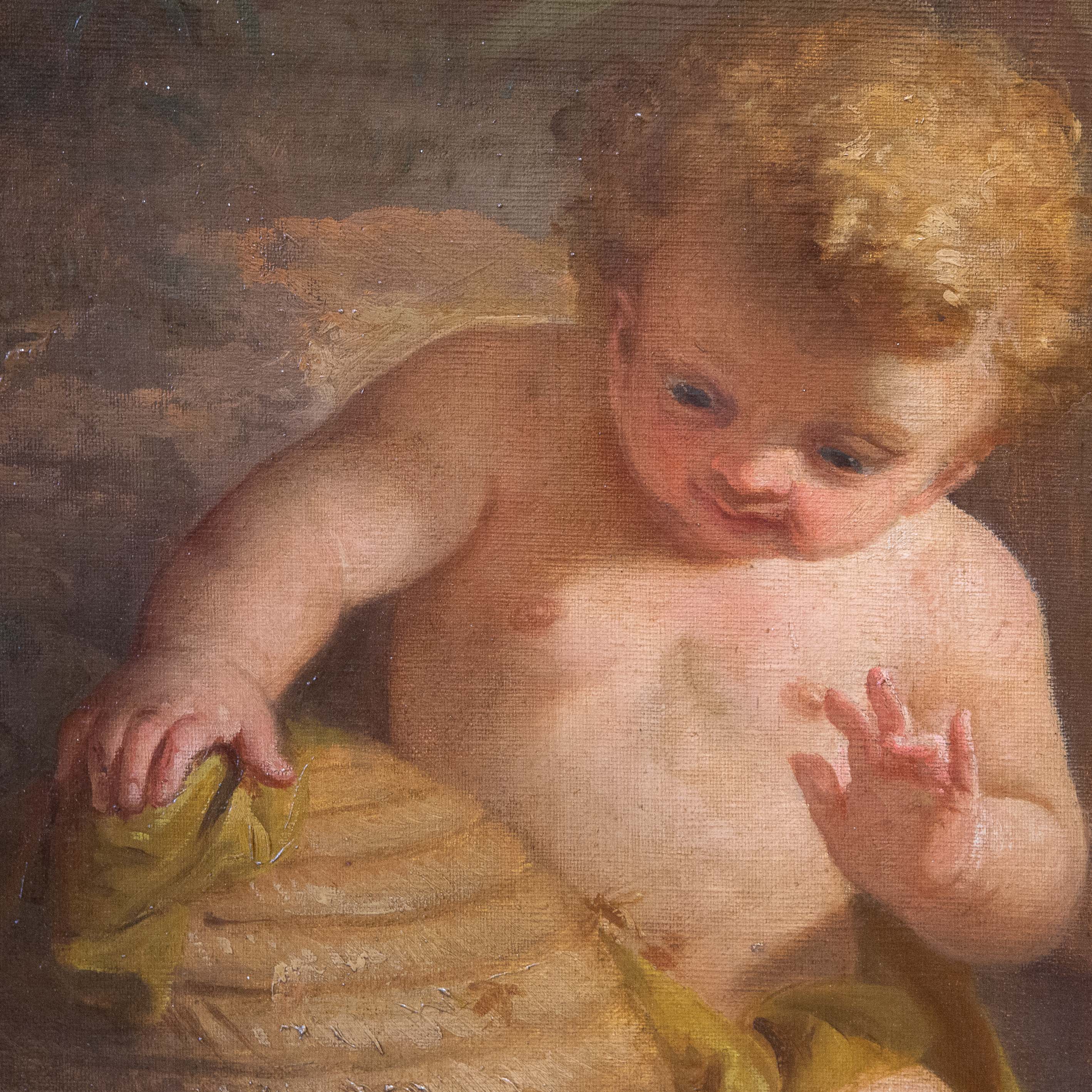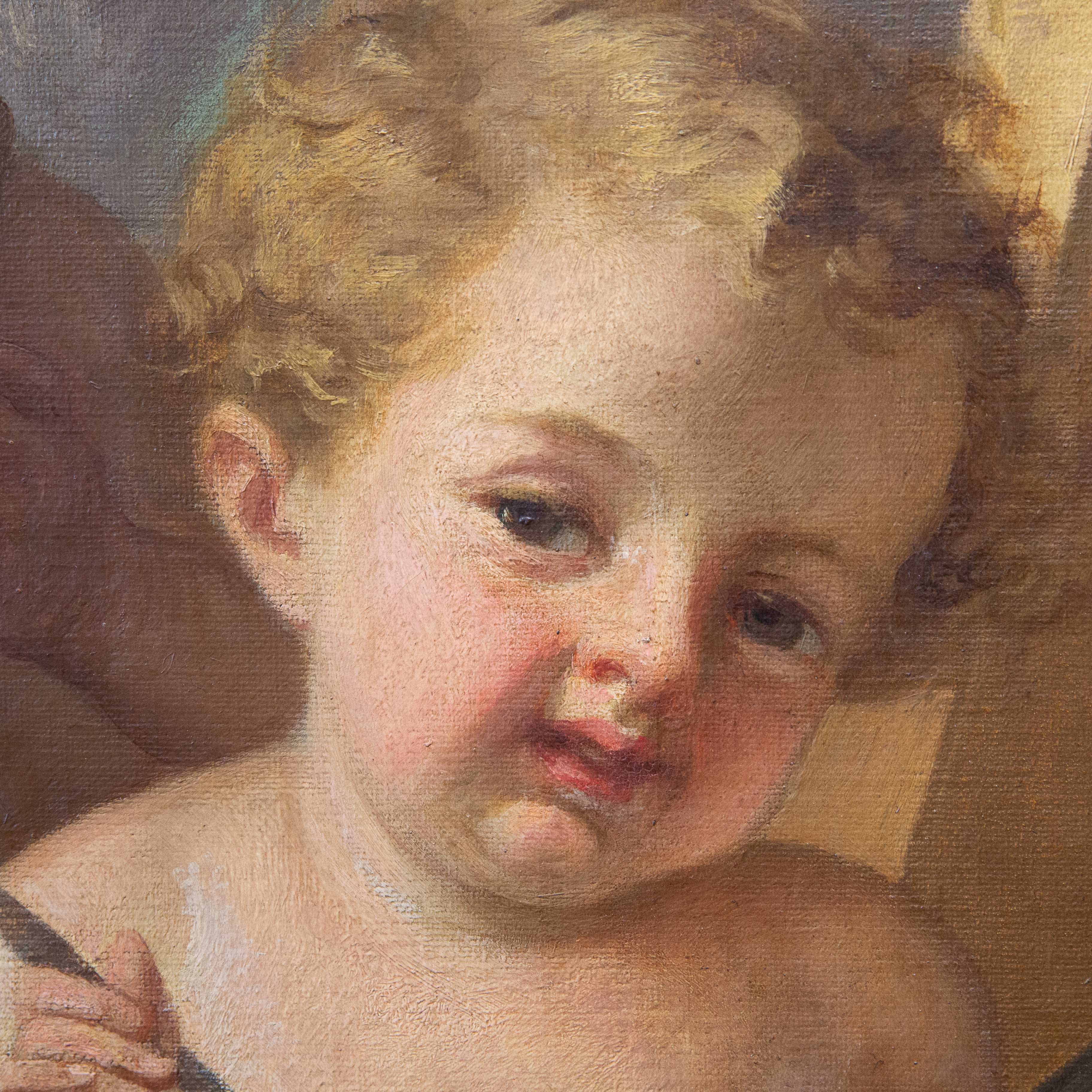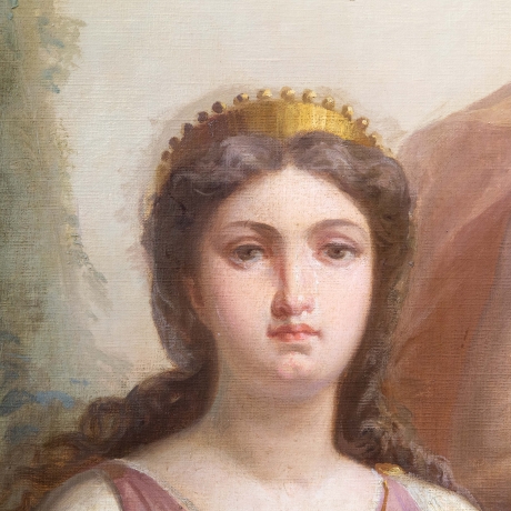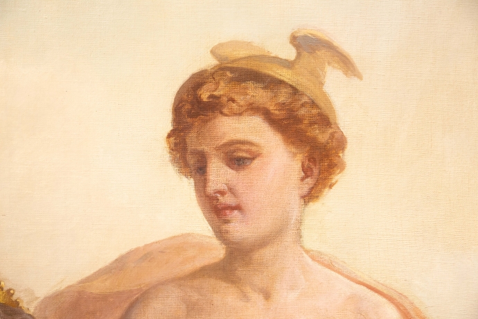 La Pittura, firmata e datata 1874, introduce il ciclo: una giovane artista, panneggiata in un ricco drappo rosso, è colta nell’atto di dipingere su cavalletto una scena di soggetto mitologico. Accanto a lei, una fanciulla osserva con attenzione, evocando il tema della trasmissione del sapere. Un putto, posto su un basamento, funge da modello vivente, mentre la resa luminosa e la cura dei dettagli floreali conferiscono alla scena un carattere intimo e colto.