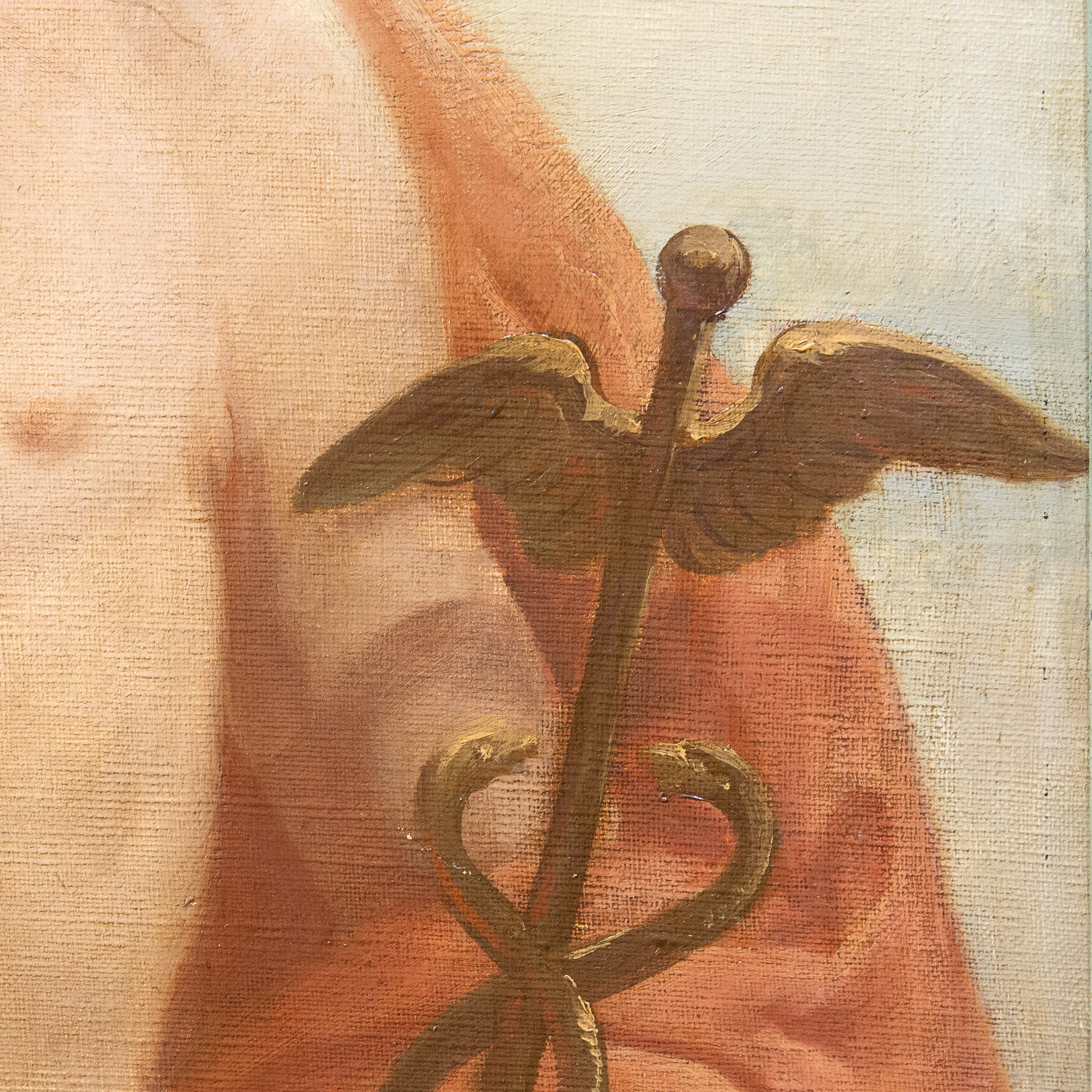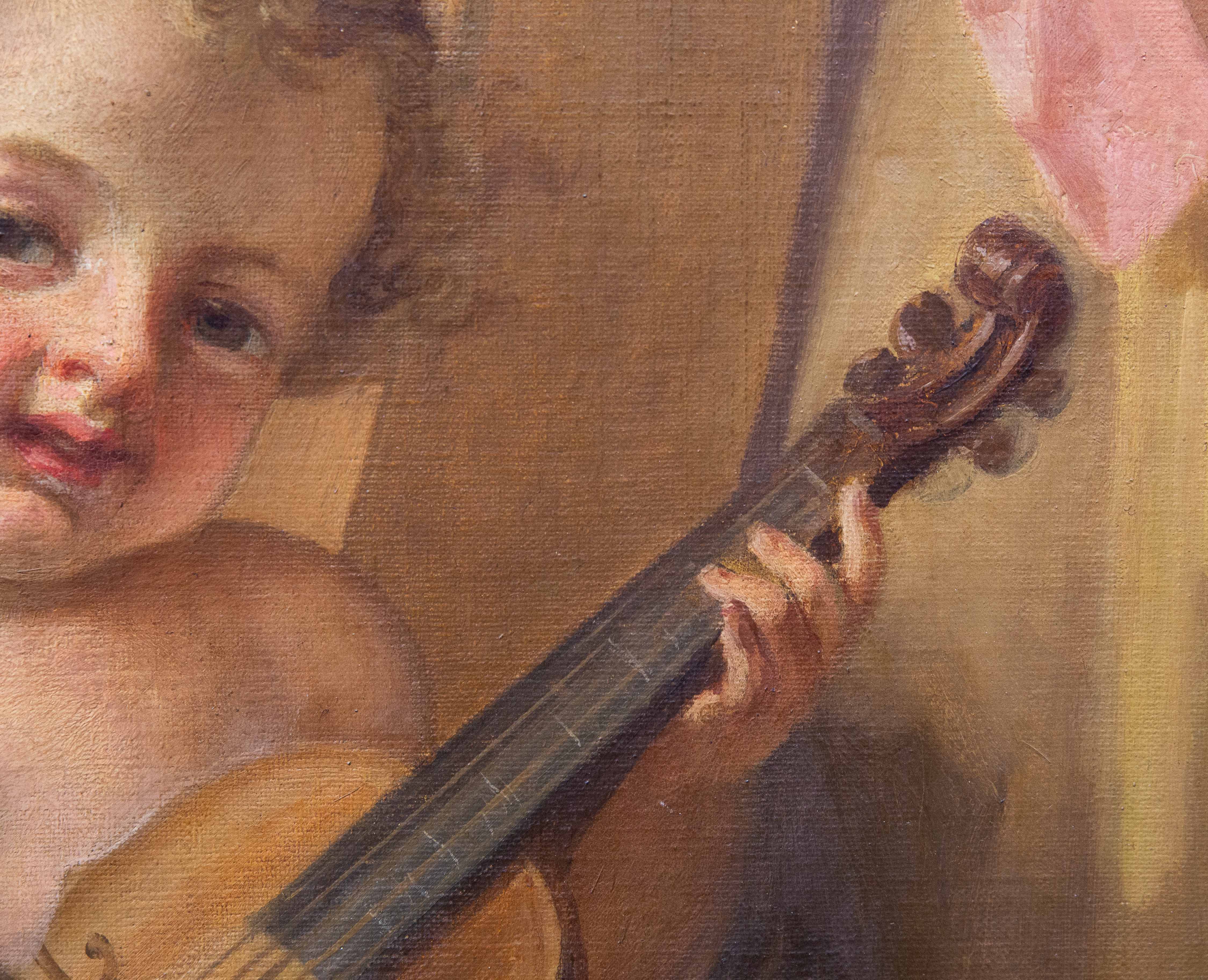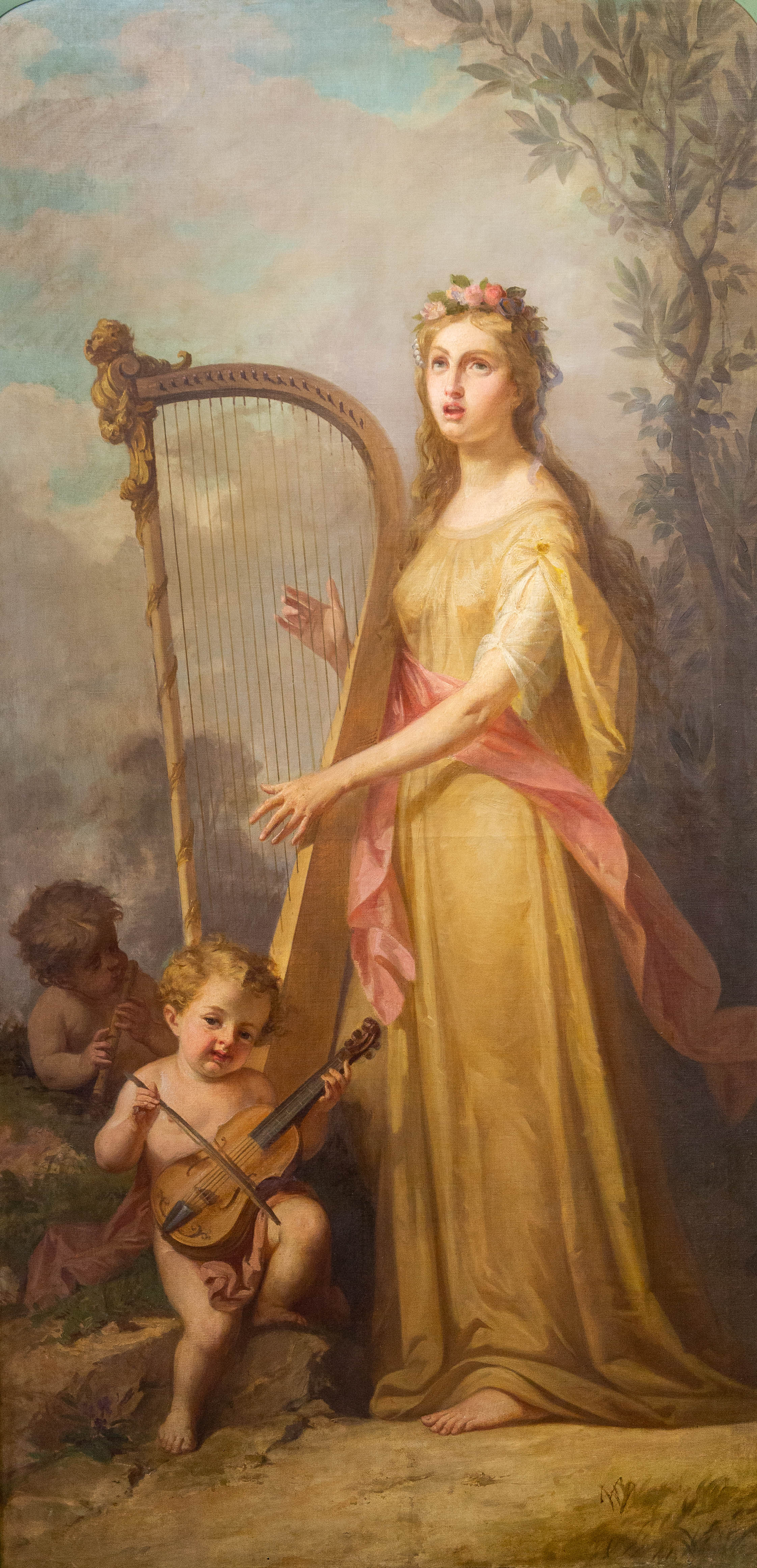 La Musica, al centro del trittico, si distingue per una maggiore apertura luministica e per l’atmosfera sospesa. La figura femminile, incoronata di fiori e avvolta in un fluido abito dorato, è rappresentata accanto a un’arpa, simbolo per eccellenza dell’armonia. Ai suoi piedi, un putto suona uno strumento a corde, rafforzando il tema musicale e introducendo un delicato movimento ritmico nella composizione.