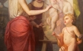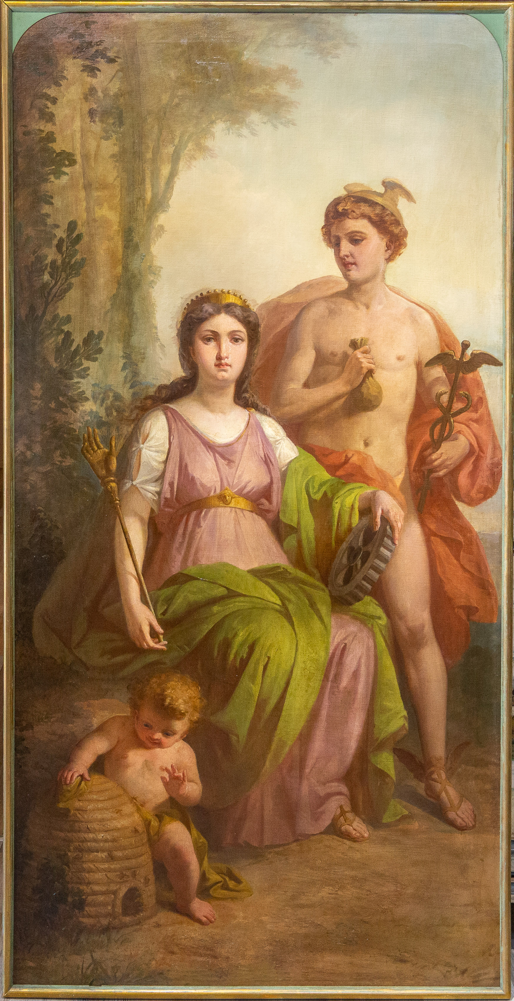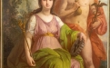 La terza tela, probabilmente riferibile a una allegoria della Poesia o del Teatro, presenta una figura femminile seduta, affiancata da un giovane maschile di ascendenza classica. Gli attributi iconografici — tra cui elementi riconducibili alla sfera teatrale e simboli di operosità come l’alveare — suggeriscono un significato più complesso, legato alla dimensione intellettuale e morale delle arti. La composizione appare più raccolta e meditativa, con una gamma cromatica calda e avvolgente.