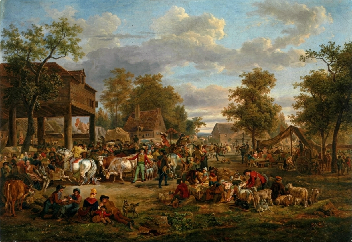 La scena è una vivace narrazione corale ambientata durante una fiera rurale. De Marne costruisce una composizione complessa ma equilibrata, dove una moltitudine di figure — contadini, mercanti, pastori e animali — interagisce in un paesaggio idilliaco illuminato da una luce calda e diffusa.