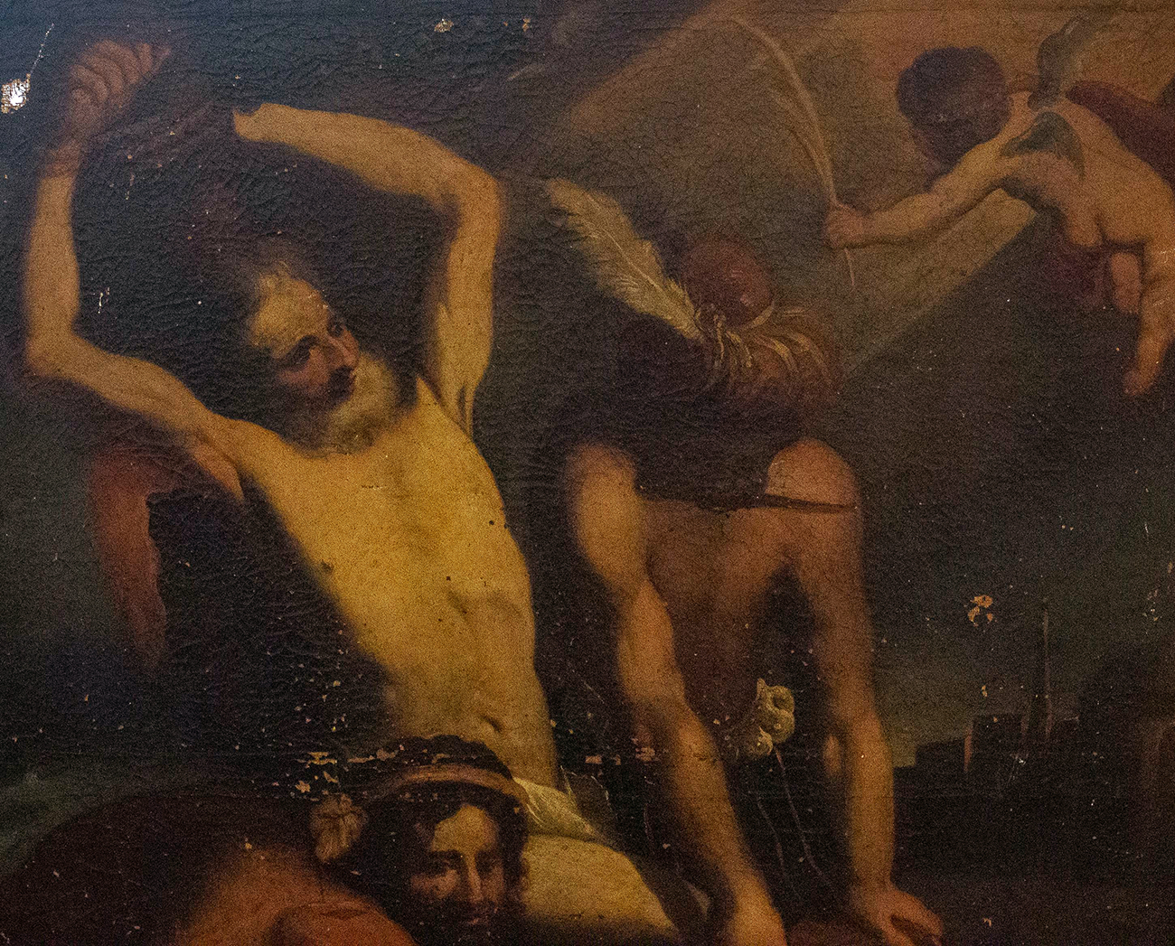 Questo imponente dipinto antico, olio su tela del XVII secolo, raffigura il Martirio di San Bartolomeo.
