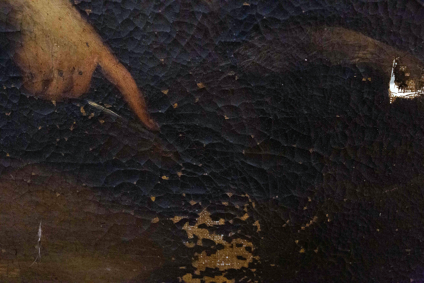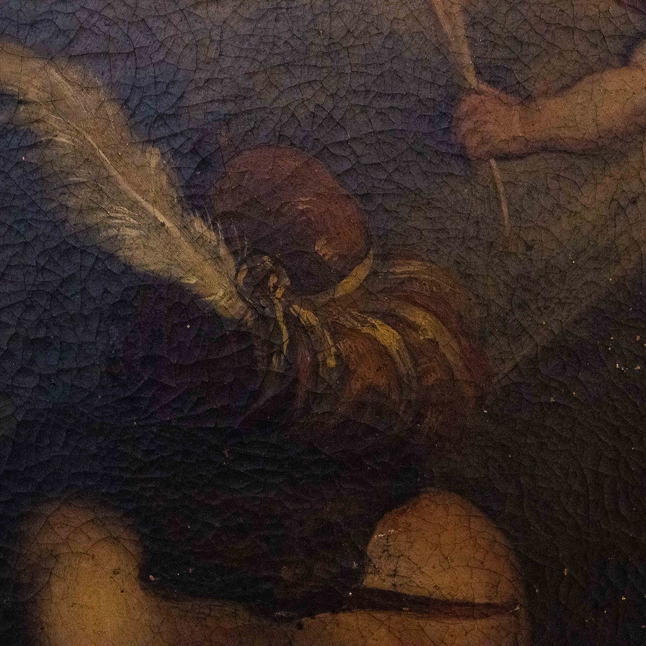 L’opera mostra segni di usura e cadute di colore, confermando la necessità di restauro: abrasioni, piccole lacune pittoriche e ossidazioni della vernice ne attenuano la leggibilità, ma al tempo stesso testimoniano l’autenticità e la lunga storia del dipinto.