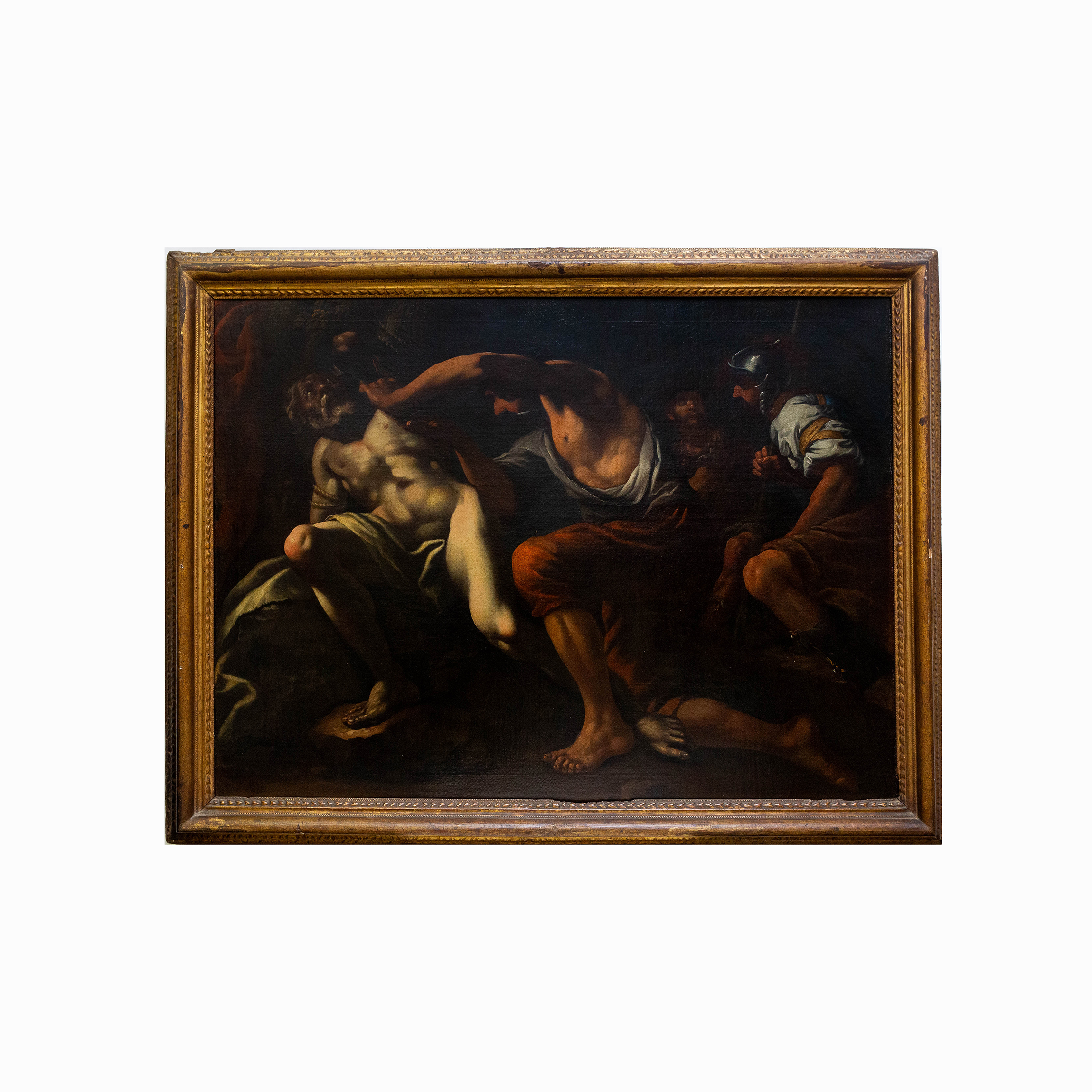 Questo dipinto antico del XVII secolo raffigura la Crocifissione di San Pietro e rappresenta un momento drammatico e intenso dell'iconografia cristiana. San Pietro è ritratto al centro della scena, con il corpo nudo, mentre viene preparato per la crocifissione. Il santo, in posizione scomoda e sofferente, è rappresentato nell’atto di essere inchiodato a testa in giù, come richiesto da lui stesso, poiché non si riteneva degno di morire nello stesso modo di Gesù Cristo. La composizione è dominata da contrasti di luce e ombra, tipici della pittura barocca e chiaroscurale del Seicento. La luce è sapientemente utilizzata per illuminare il corpo muscoloso di San Pietro, enfatizzandone la tensione e l’intensità emotiva, mentre le figure dei carnefici sono avvolte in ombre più profonde, quasi emergendo dal buio. La torsione dei corpi e l'espressione tesa dei carnefici contribuiscono a rendere la scena estremamente dinamica e drammatica. La cornice originale, coeva al dipinto, aggiunge autenticità e valore storico all'opera, inserendola in un contesto di devozione e culto tipico dell’epoca.