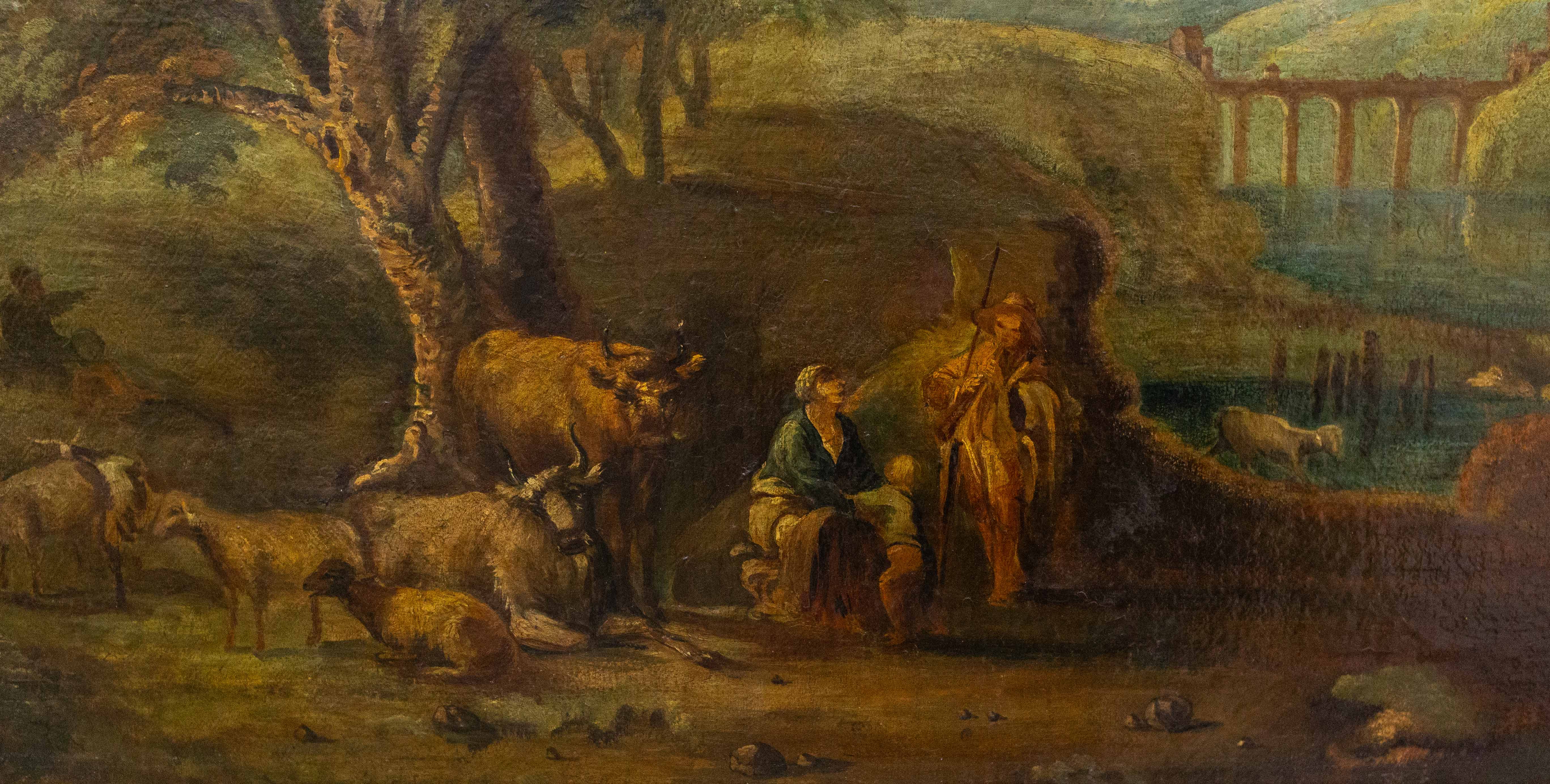 Splendido dipinto ad olio su tela raffigurante paesaggio bucolico nella più tipica tradizione antica dove una grande varietà di personaggi percorre la strada a fianco di un fiume. La scena è permeata da quell' inimitabile alone fiabesco e che rese celebri i maestri del passato.