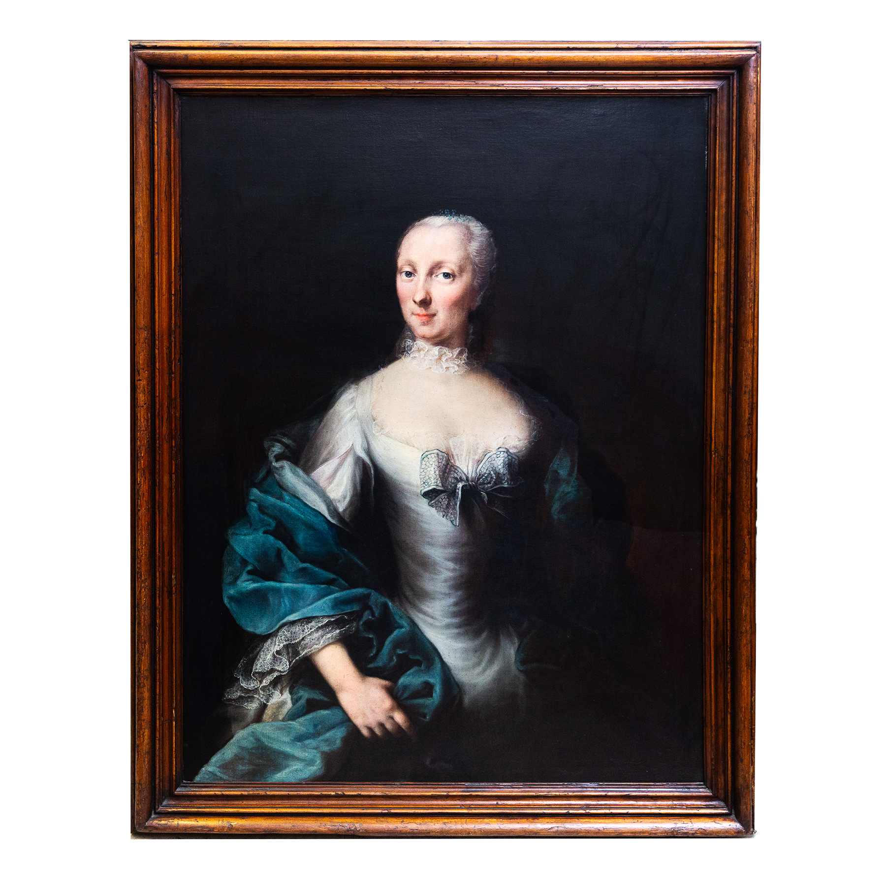 Elegante ritratto femminile a mezza figura, ambientato su fondo scuro e neutro, secondo i canoni della ritrattistica aristocratica del Settecento. La giovane nobildonna è raffigurata con posa composta e leggermente ruotata, lo sguardo diretto verso l’osservatore, in un atteggiamento di sobria sicurezza e grazia.