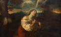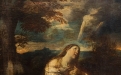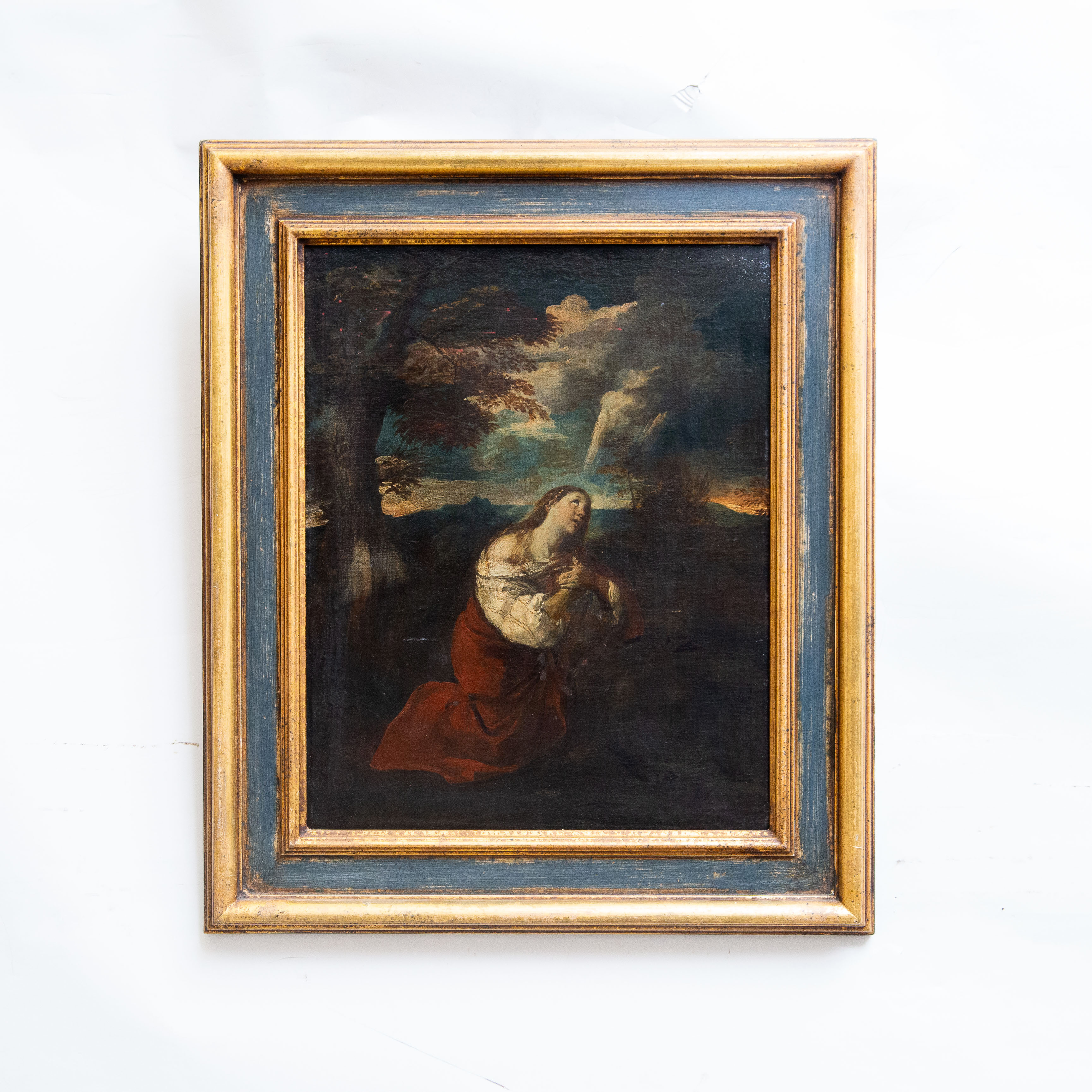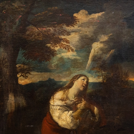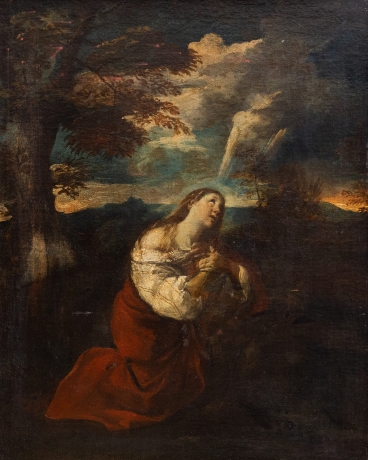 In questa raffinata composizione di epoca settecentesca, la figura di Maria Maddalena emerge con intensa forza emotiva in un paesaggio crepuscolare, carico di suggestioni spirituali. La santa è rappresentata inginocchiata, colta in un momento di profonda estasi mistica: lo sguardo rivolto verso il cielo e le mani raccolte al petto traducono visivamente un sentimento di abbandono e redenzione.