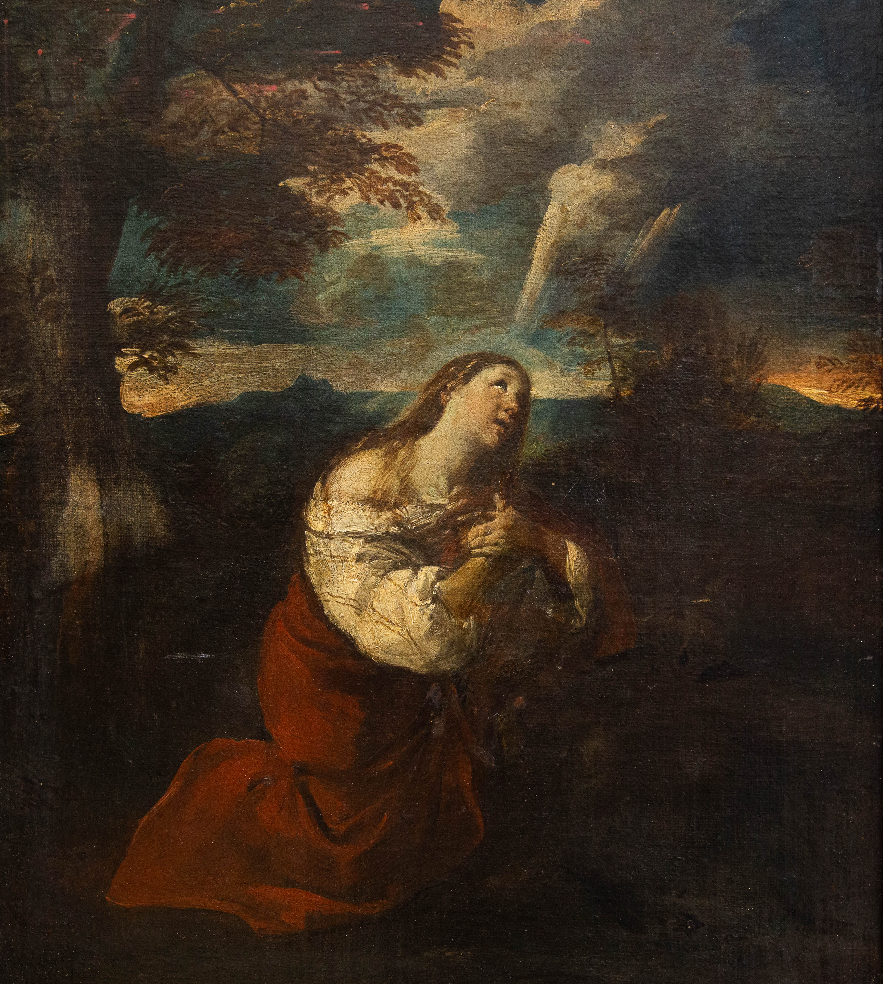 La scena è costruita attraverso un sapiente uso del chiaroscuro, dove la luce, proveniente dall’alto, squarcia le nubi e si posa delicatamente sul volto e sul busto della Maddalena, rendendola fulcro luminoso della composizione. Il contrasto con il paesaggio circostante – caratterizzato da tonalità scure e vibranti, alberature mosse e un cielo inquieto – amplifica la tensione drammatica e spirituale dell’opera.