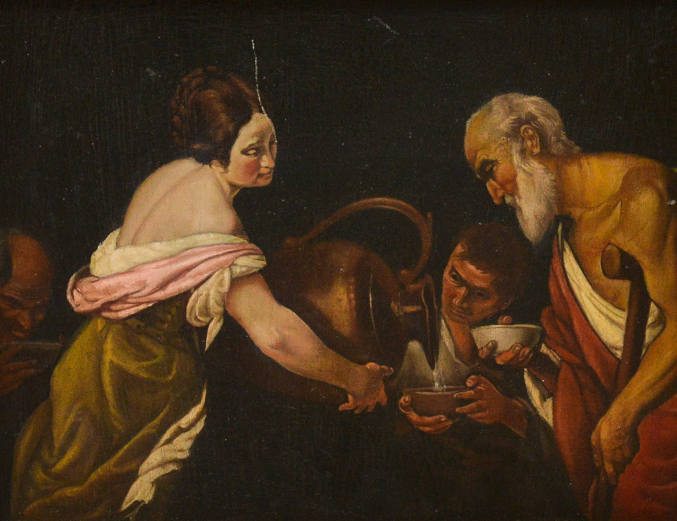 Bozzetto di scena seicentesca ad olio su tavoletta risalente alla fine dell'800. In cornice dorata a mecca coeva.