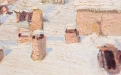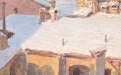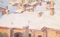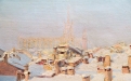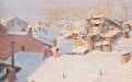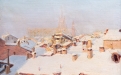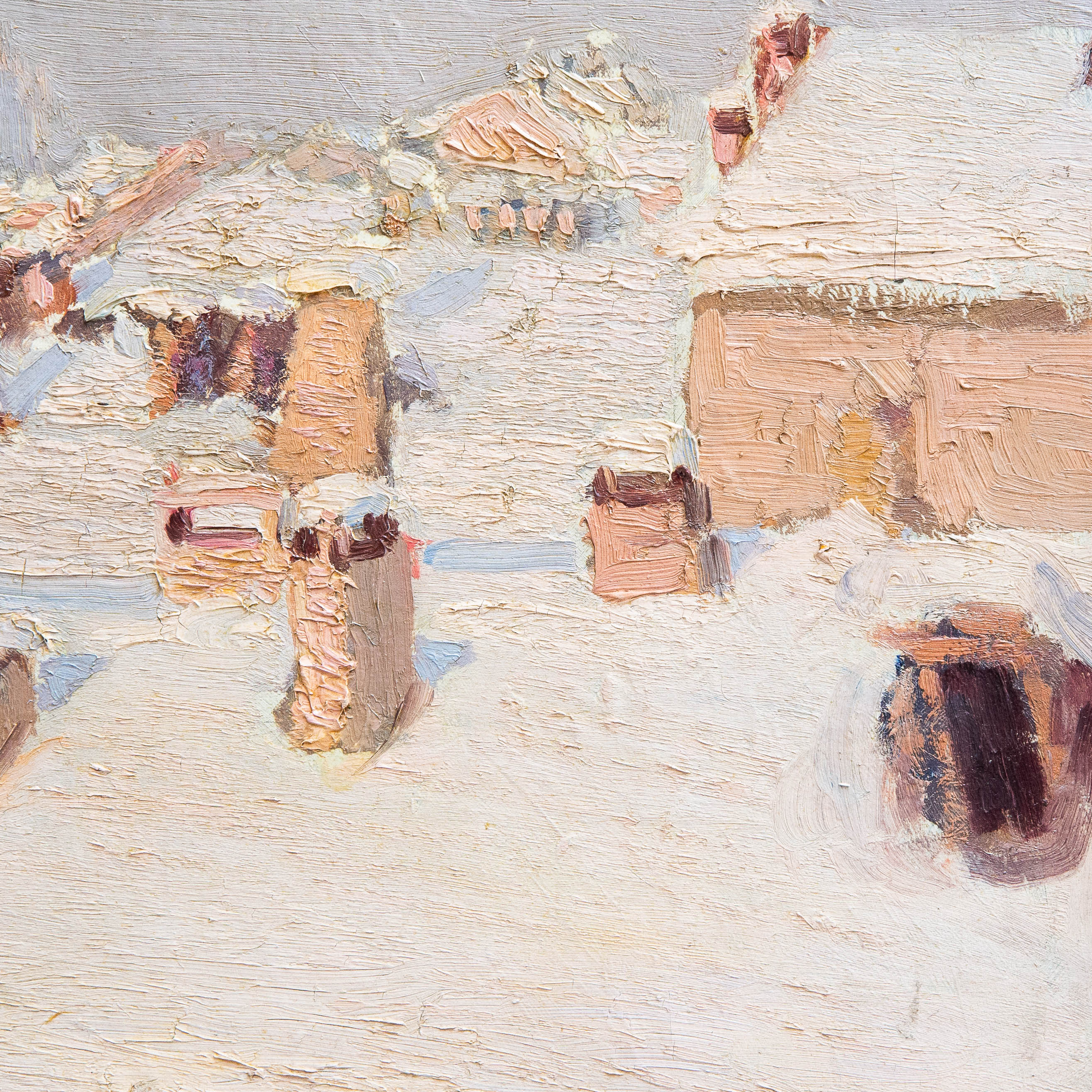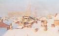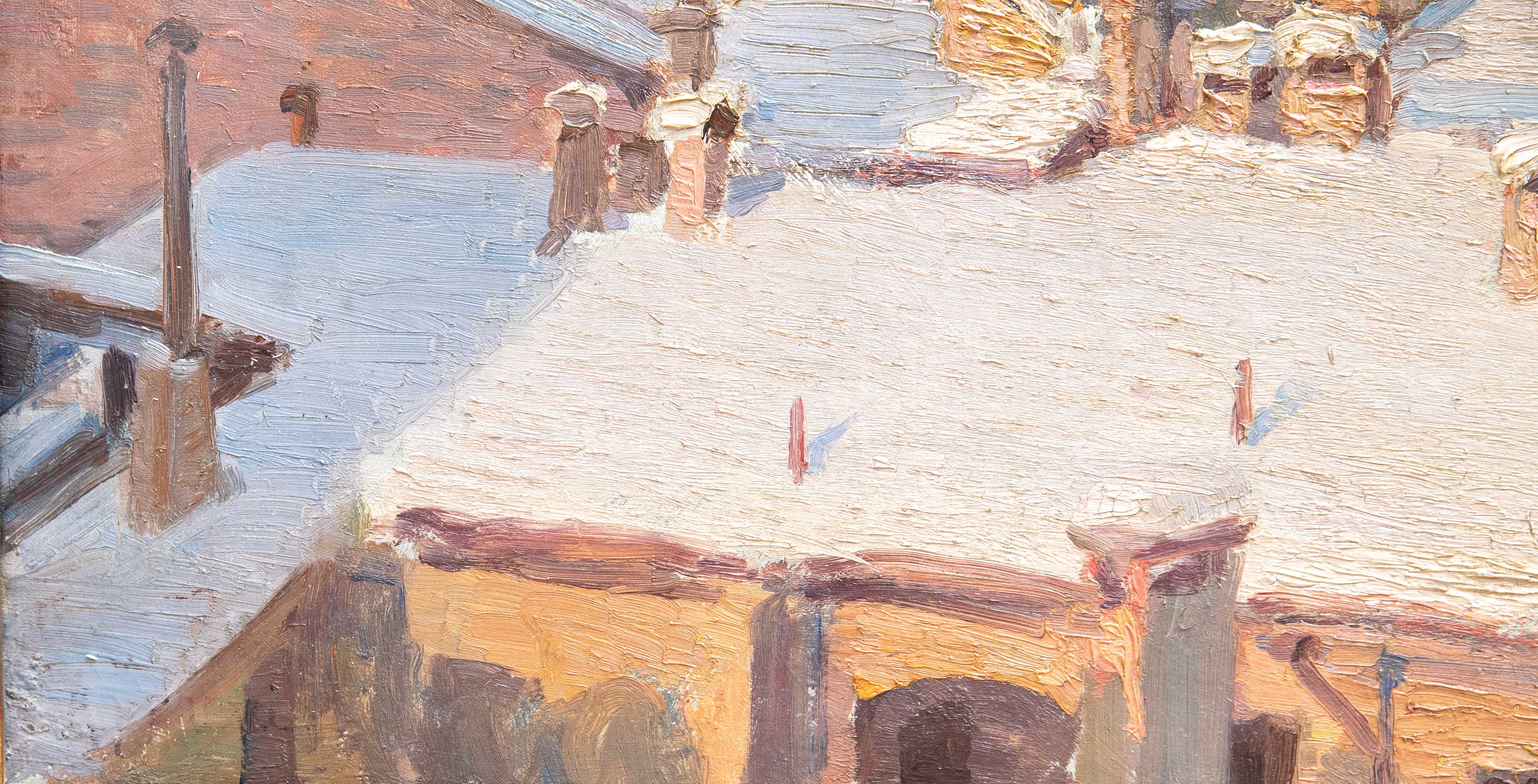 Suggestiva veduta urbana invernale, animata da una delicata atmosfera ovattata, in cui la città si presenta sotto una soffice coltre di neve. La composizione si sviluppa attraverso una successione di tetti e volumi architettonici resi con pennellate corpose e materiche, che catturano la luce fredda del paesaggio innevato.