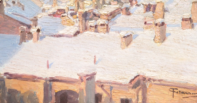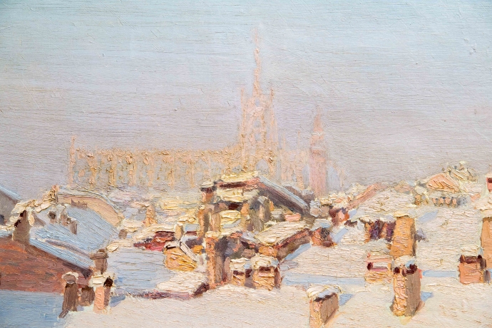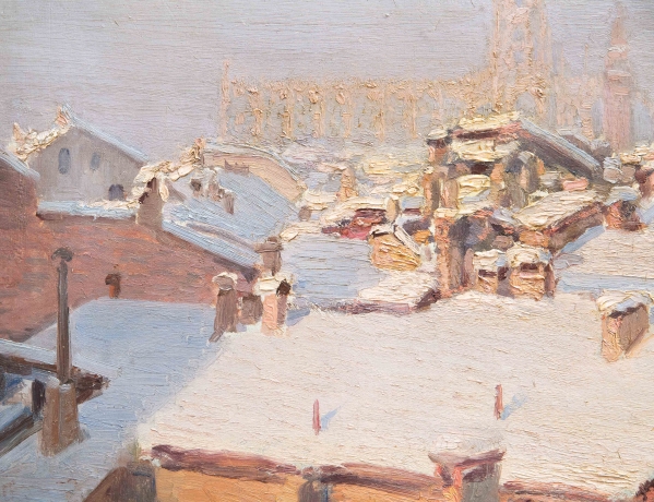 “Nevicata sui tetti di Milano”, Dipinto ad olio su tela, XX secolo
