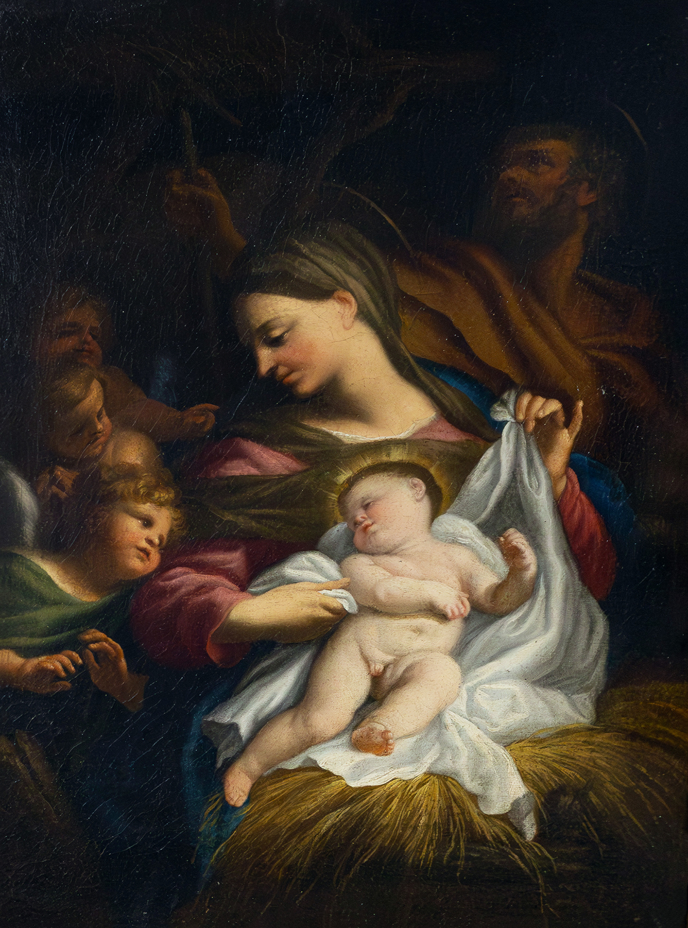 Al centro della composizione si trova la Vergine, colta in un gesto materno mentre osserva con dolcezza il Bambino Gesù, adagiato su un morbido drappo bianco. La luce, calda e concentrata sulle figure principali, esalta i volti e crea un forte contrasto con lo sfondo più ombroso, conducendo lo sguardo verso il nucleo emotivo della scena.