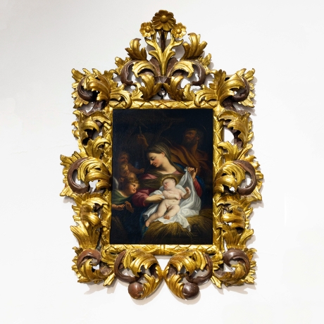 L’opera è valorizzata da una ricca e scenografica cornice intagliata e dorata, di gusto barocco, che ne esalta la preziosità e la profondità cromatica.
