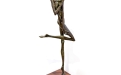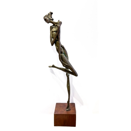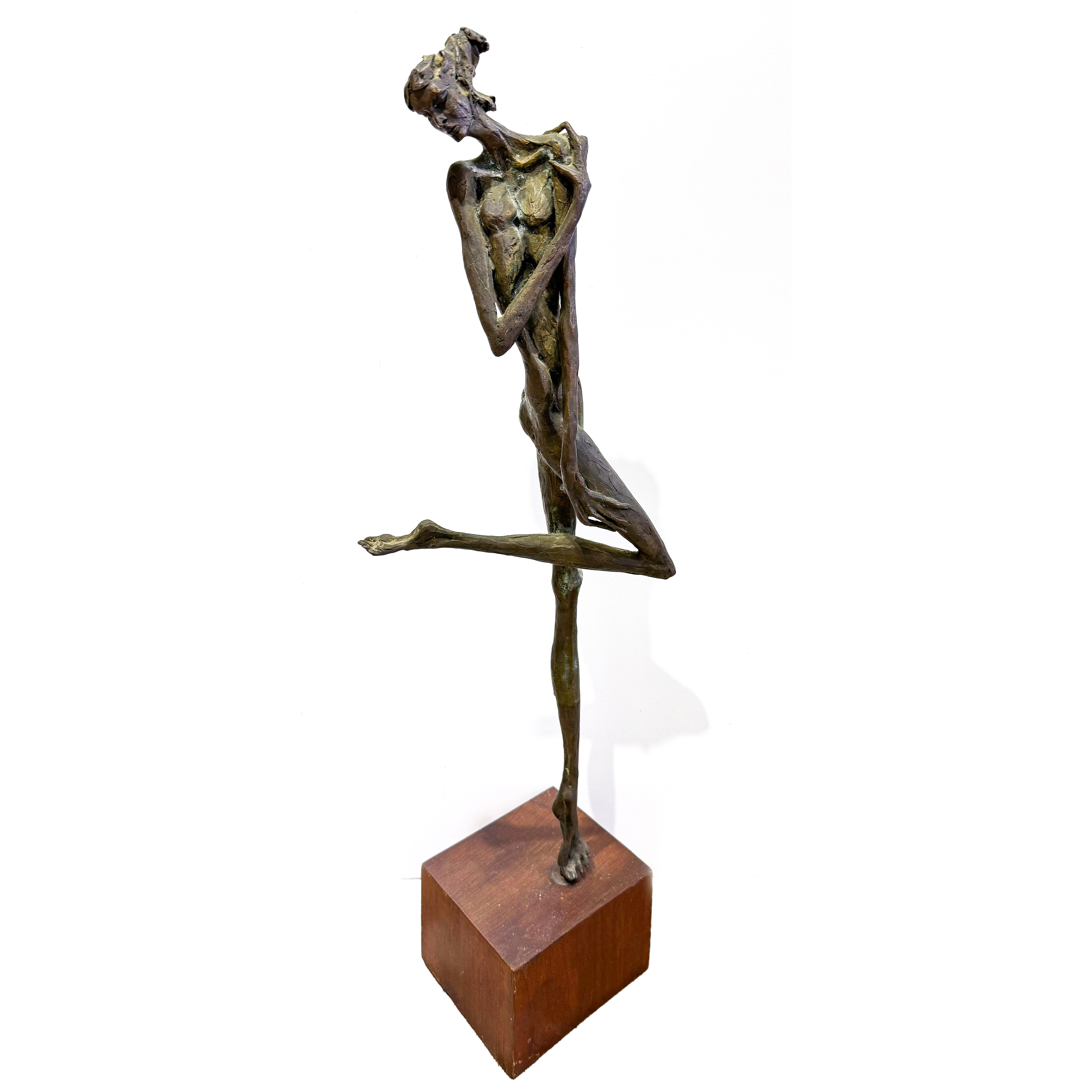 L’opera raffigura una figura femminile stilizzata colta in una posa di delicato equilibrio, sospesa su un solo punto d’appoggio. Il corpo slanciato e filiforme si sviluppa verticalmente con grande eleganza, mentre l’arto sollevato e la torsione del busto conferiscono alla composizione un senso di movimento trattenuto, quasi meditativo.