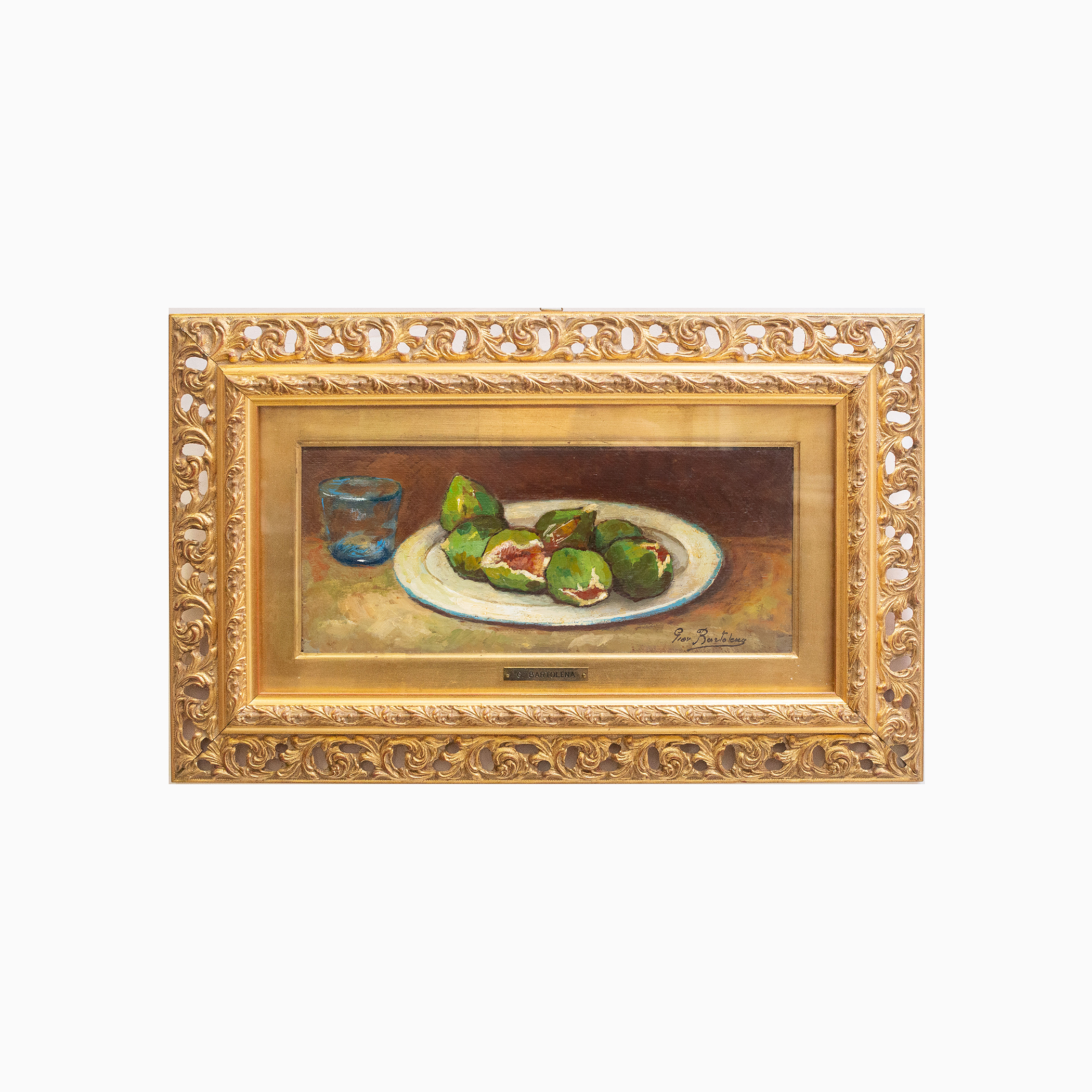 Bel dipinto raffigurante "Natura morta", tavola con vetro e piatto di fichi.