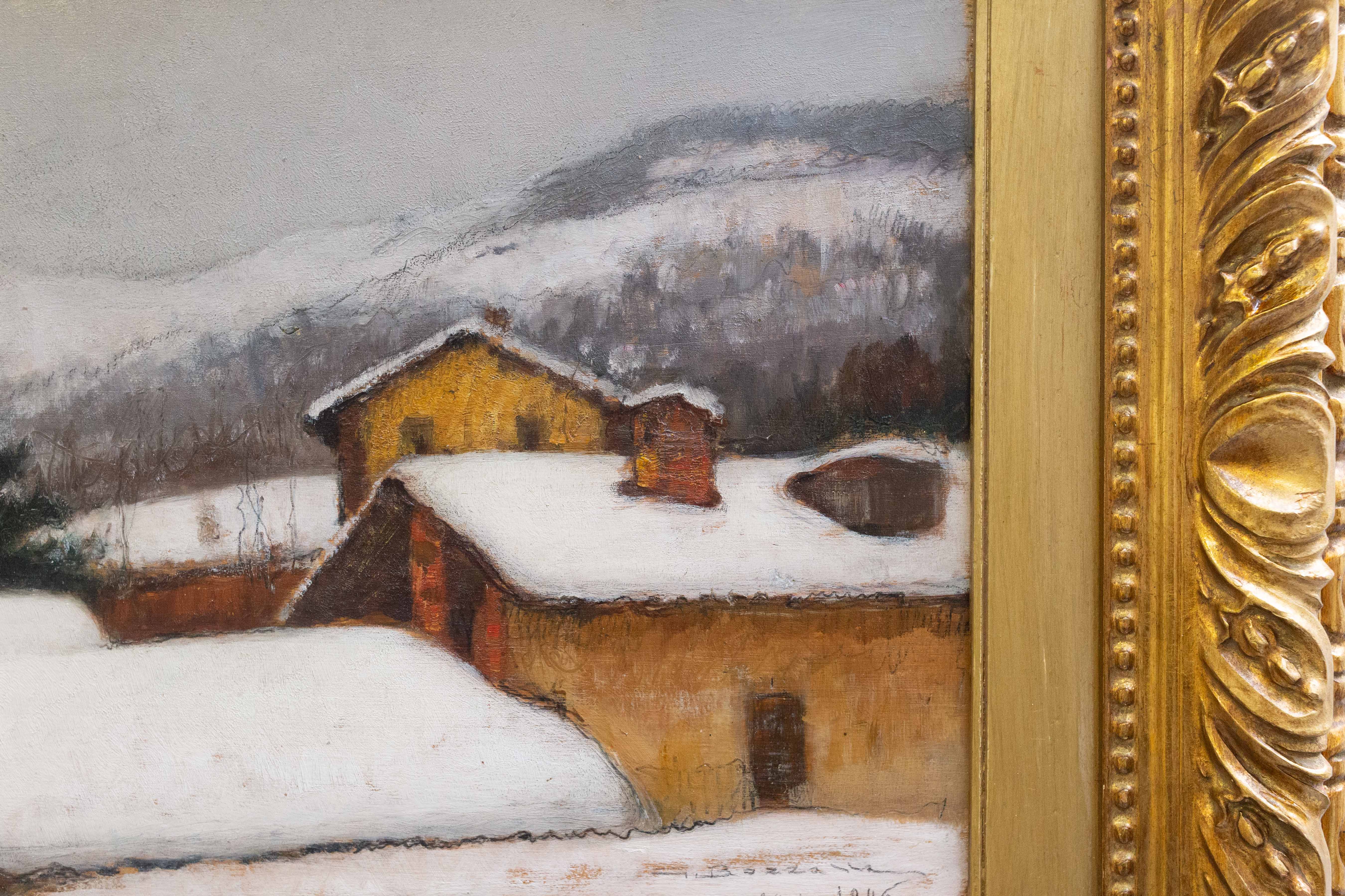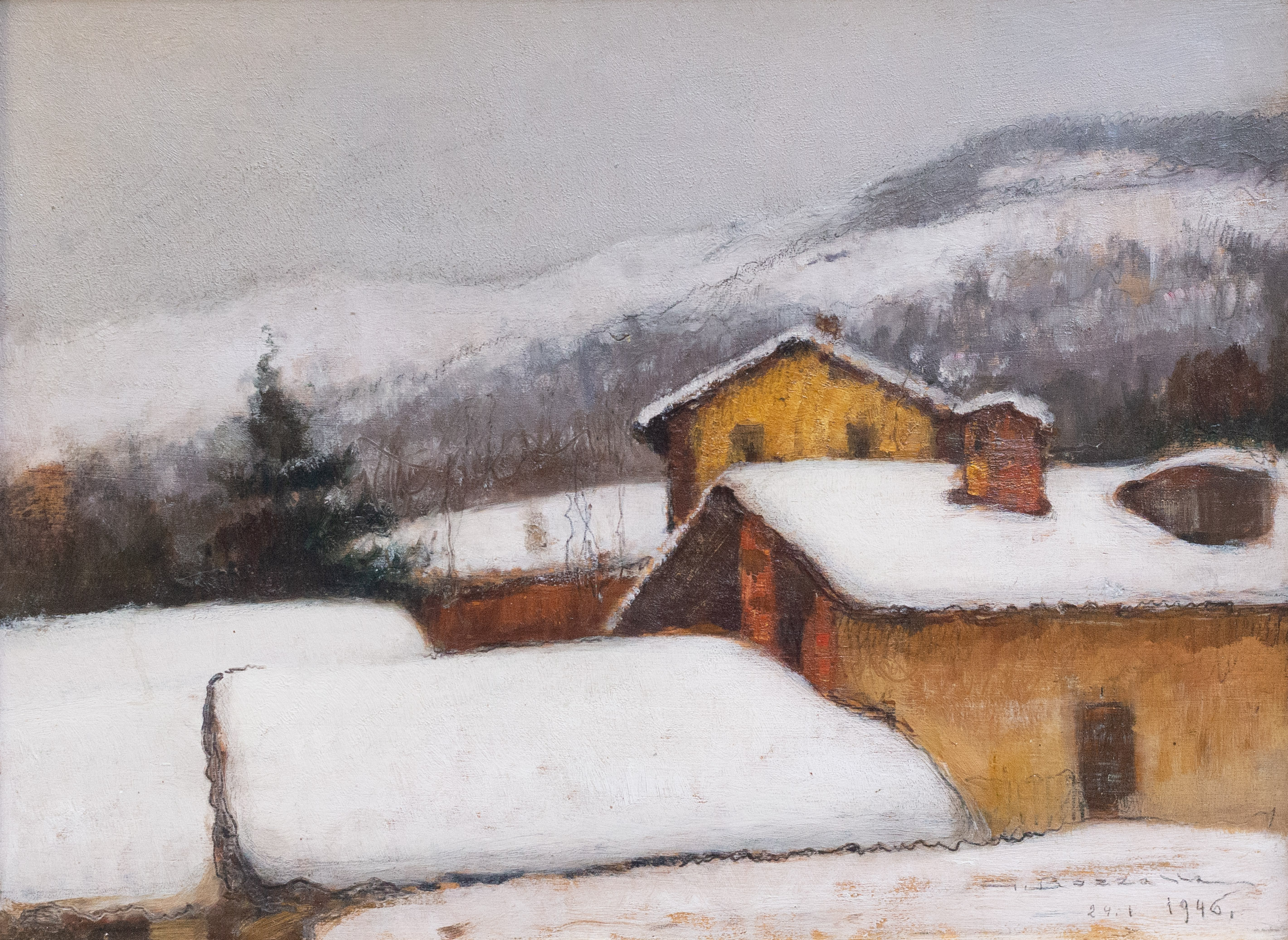 Olio su tavola, di Giuseppe Bozzalla, "Paeasaggio con neve", 1946, firmato e datato