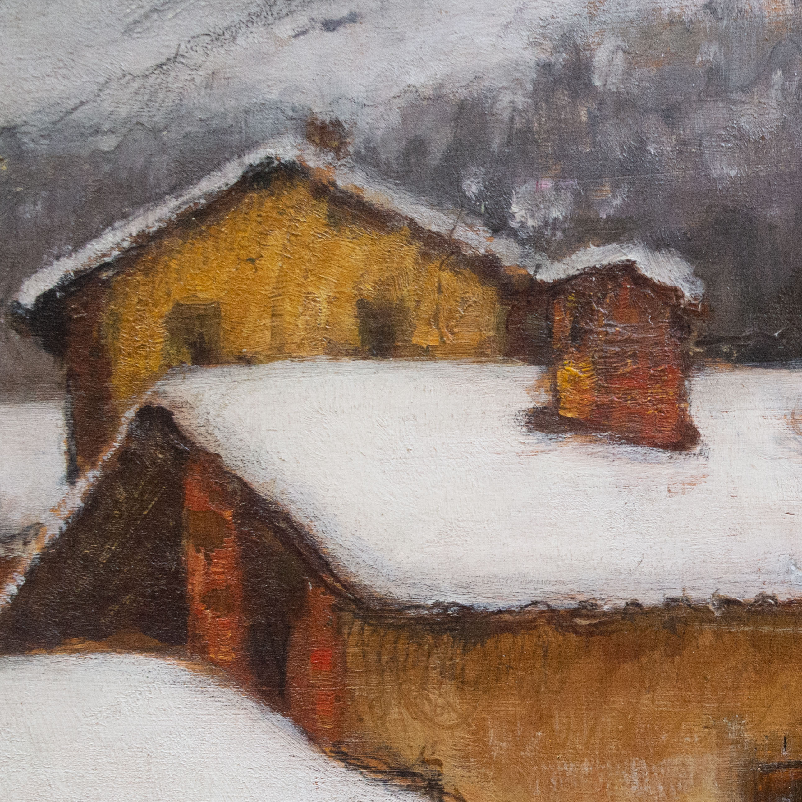 Bel dipinto raffigurante uno scorcio dopo una nevicata, con il classico cielo grigio.