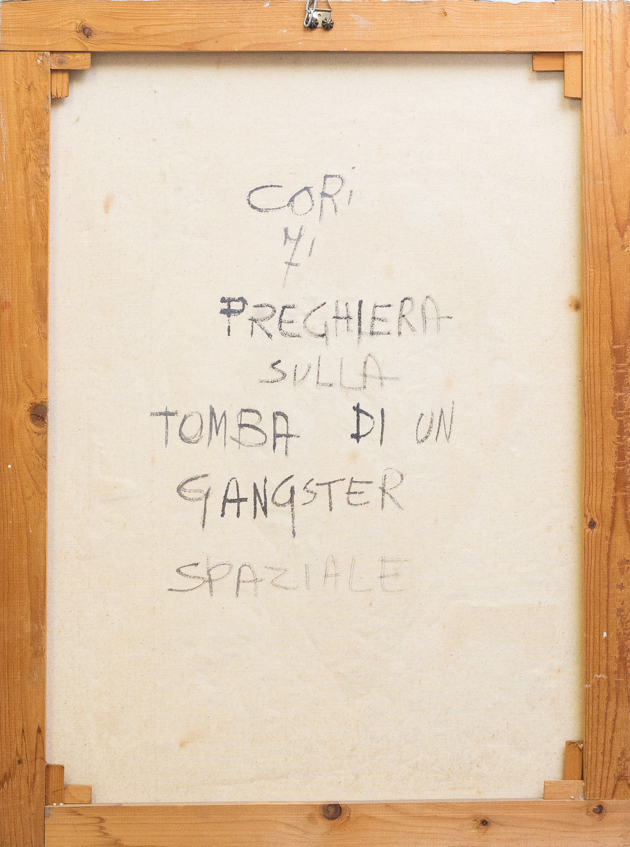 Tecnica mista su tela, di Giancarlo Cori, " Preghiera sulla Tomba di un Gangster Spaziale", 1971