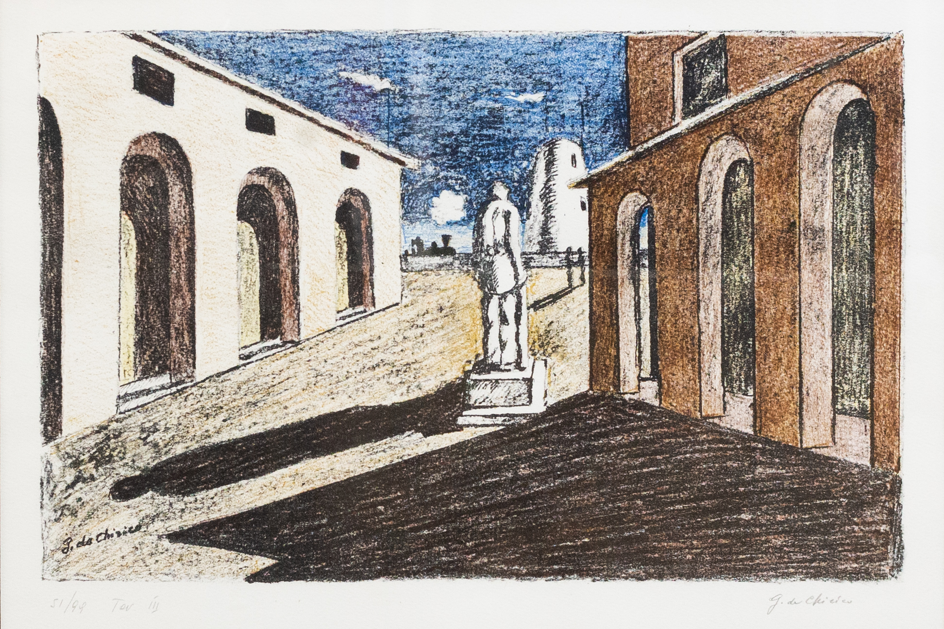 Firma in lastra in basso a sinistra: G. de Chirico, firma a matita sul margine in basso a destra: G. de Chirico, in basso a sinistra tiratura: 51/99 Tav. III.