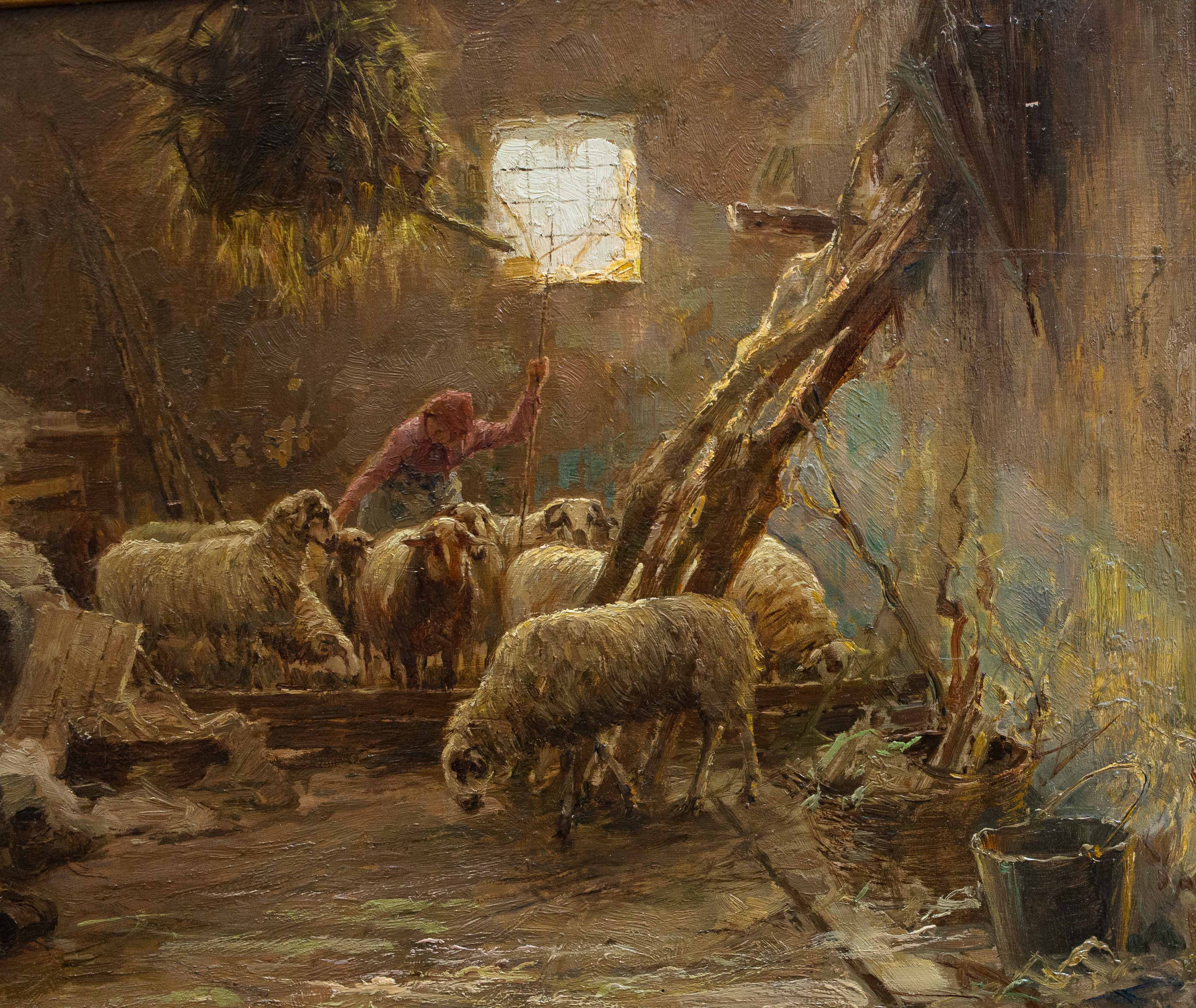 L’opera raffigura un suggestivo interno rurale animato da un gruppo di ovini all’interno di una stalla, colti in un momento di vita quotidiana. La scena è ambientata in uno spazio raccolto e semioscuro, illuminato da una luce naturale filtrante da una piccola apertura sul fondo, che crea un sapiente gioco di chiaroscuri e conferisce profondità e atmosfera alla composizione.