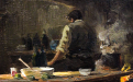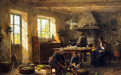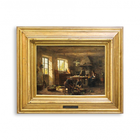 Bel dipinto di Giuseppe Gheduzzi, raffigurante interno di cascina con cinque personaggi in una classica scena di genere