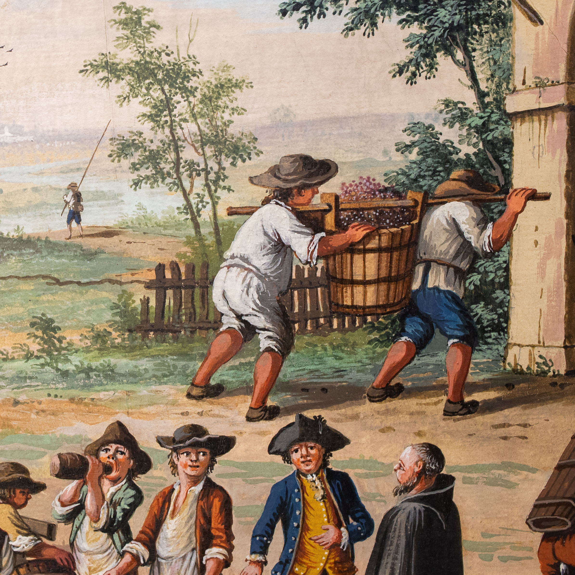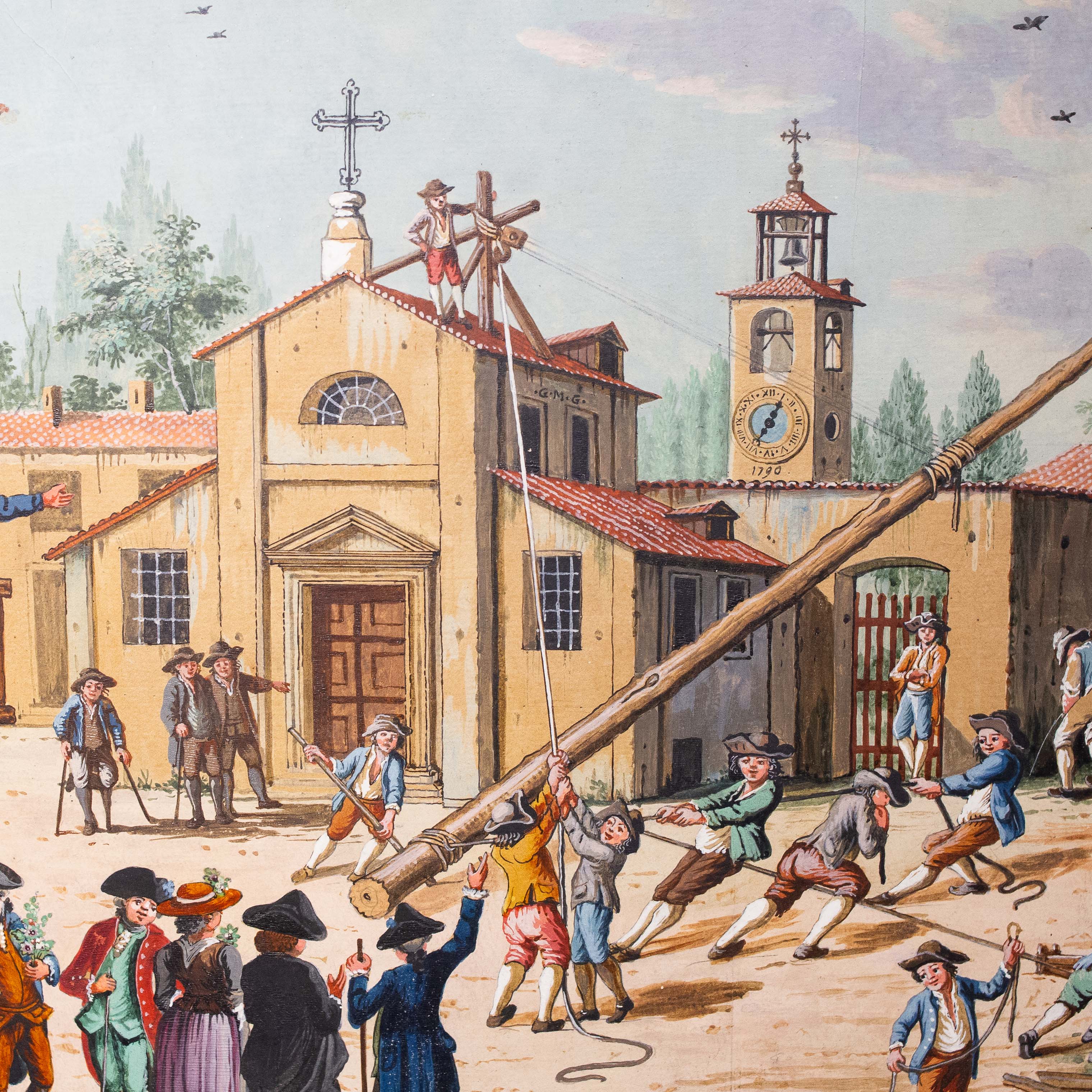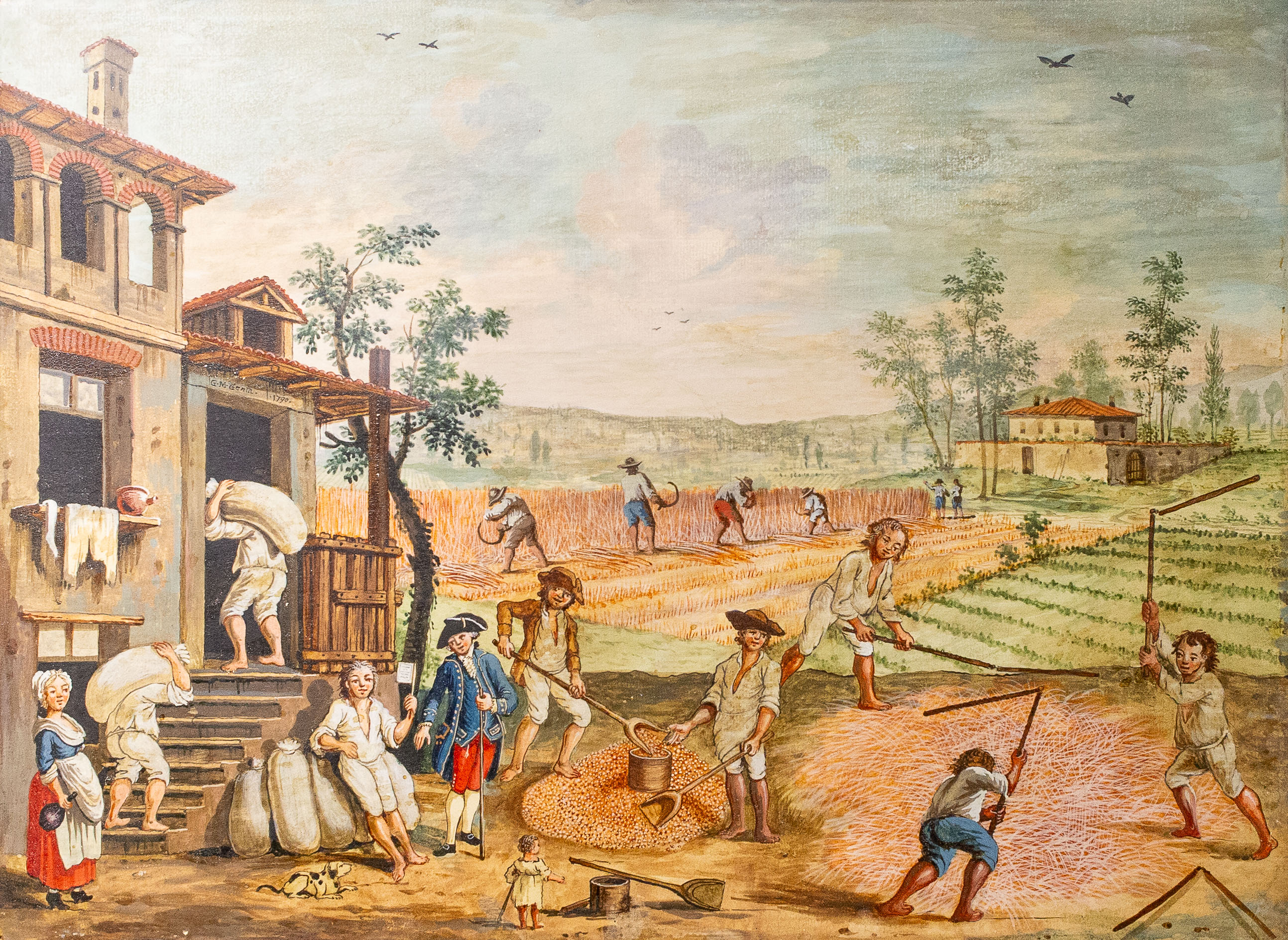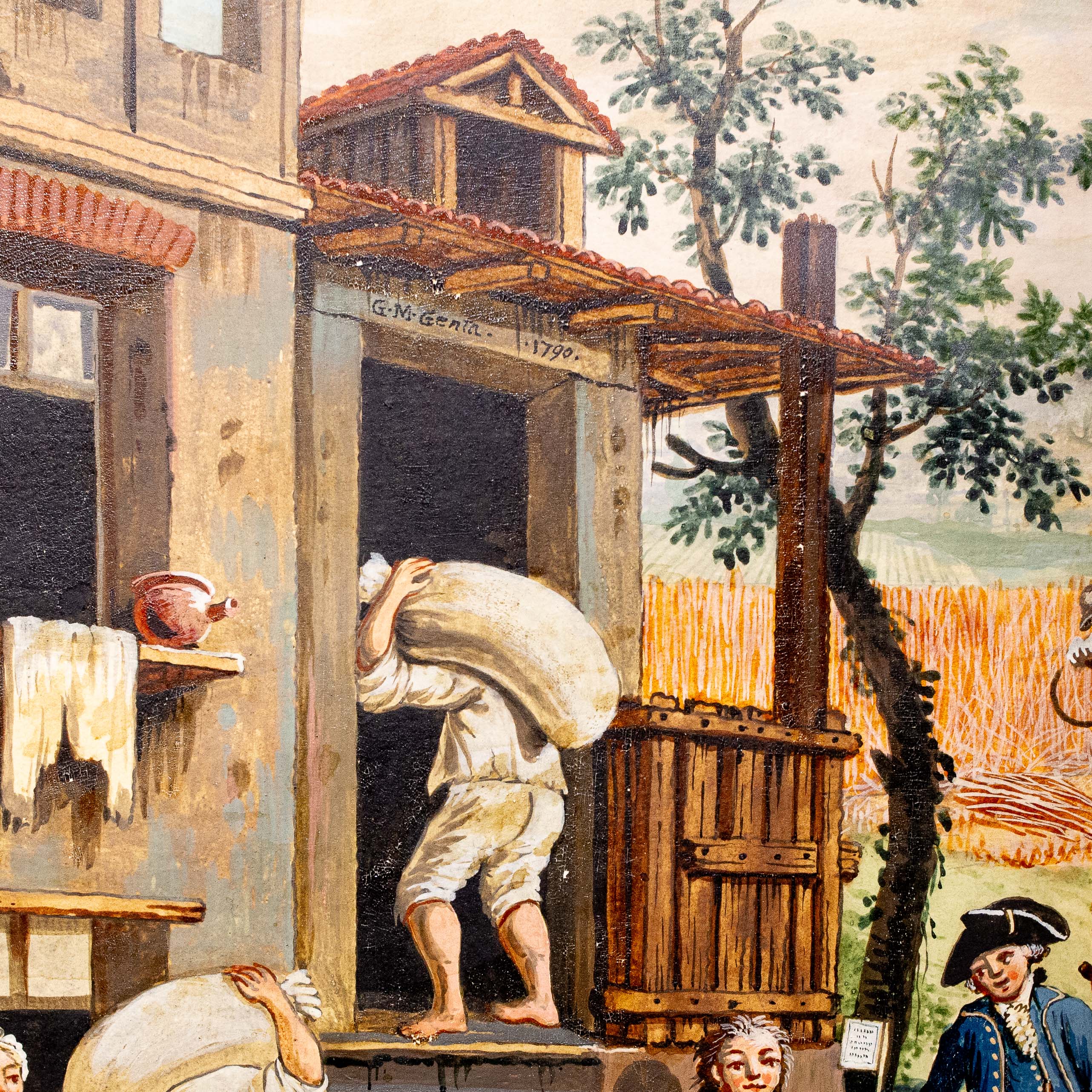 Le figure, caratterizzate da abbigliamenti tipici della fine del XVIII secolo, si muovono in spazi prospetticamente costruiti, con un’attenzione quasi documentaria alla vita contadina e alle architetture rurali.