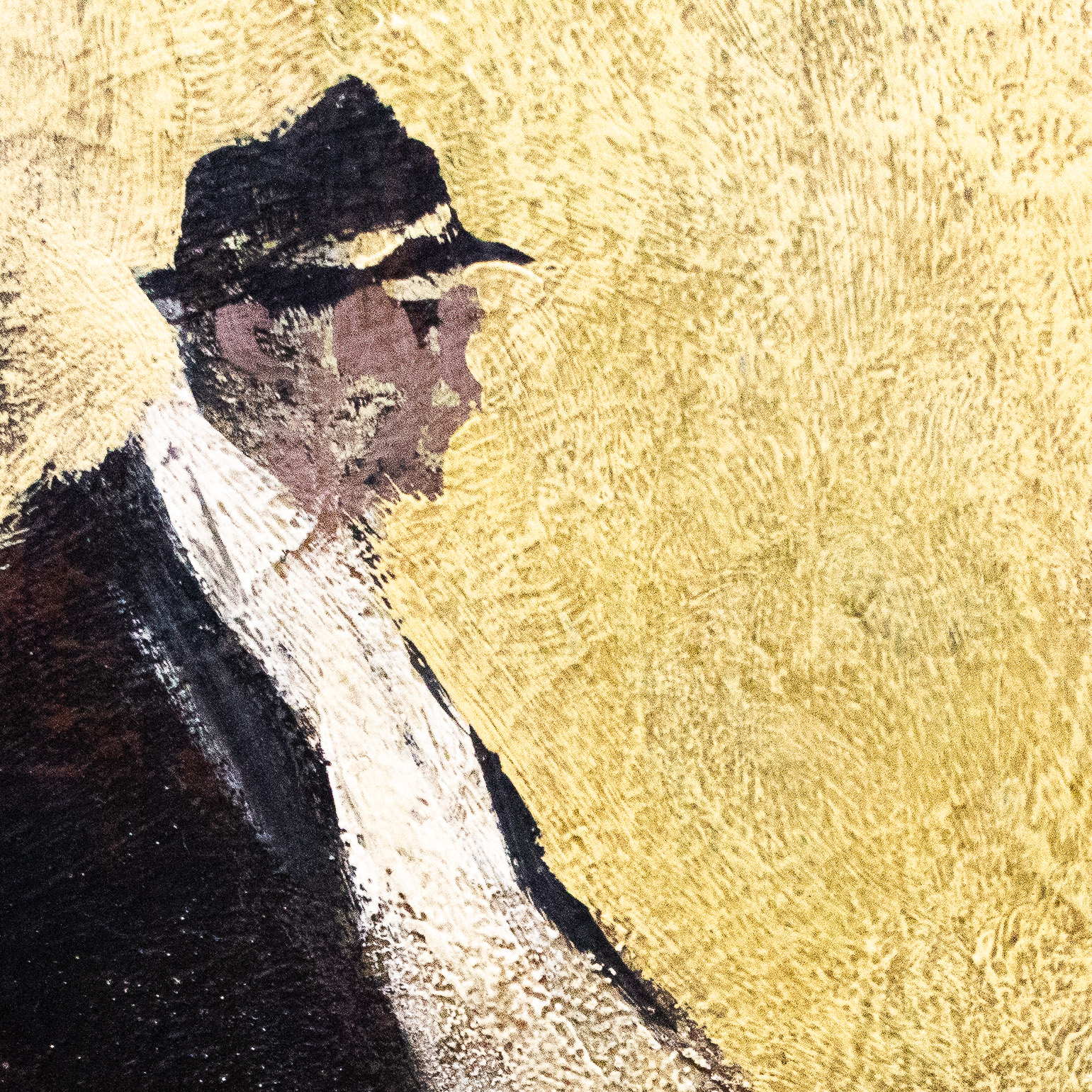 Dipinto ad olio su tela del pittore Giancarlo Cori raffigurante una scena di genere in città.
