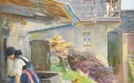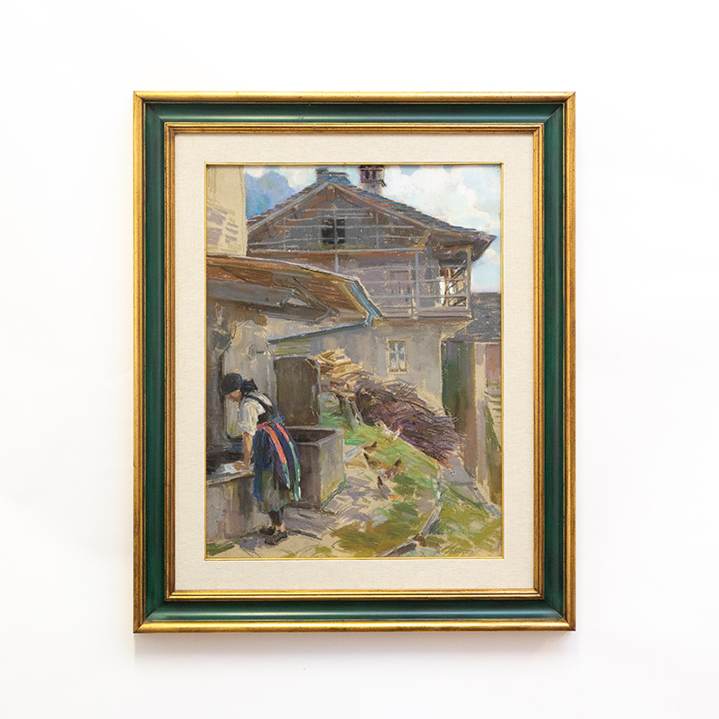 Alla fontana di Rimella in Valsesia, pastello su cartone di Gino Piccioni (1873-1941), firmato in basso a destra e iscrizione al retro.