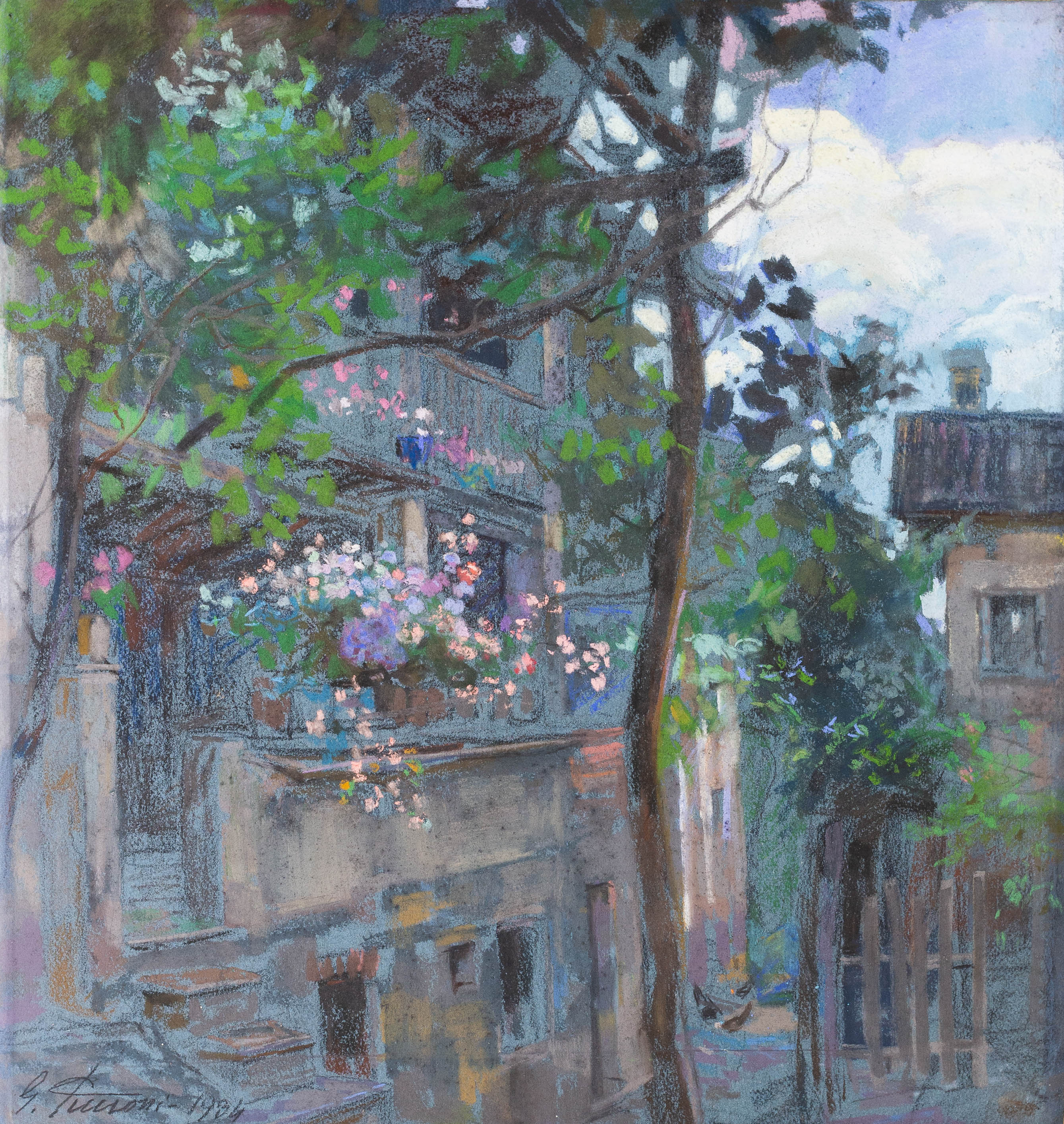 Bel pastello del pittore Gino Piccioni, raffigurante rustico con fiori e personaggi nel territorio laniero biellese. In quest'opera possiamo ammirare l'abilità di evocare sensazioni poetiche e simboliche.