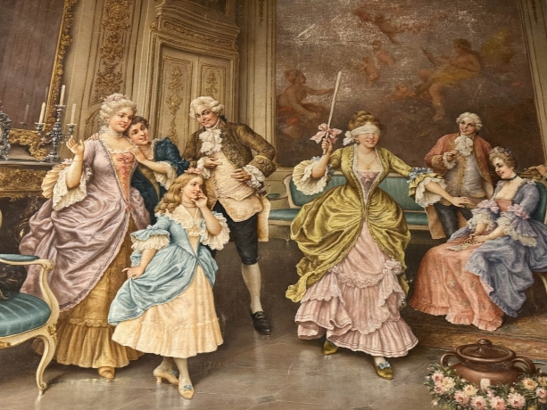 Romantico e grande Arazzo firmato Giotto Lamponi, noto pittore operativo a cavallo tra l'800 e il '900. Famoso artista italiano che fece della sua arte la rappresentazione sia religiosa che di vita di corte nei più vari aspetti, dalle classiche scene ai momenti più divertenti.