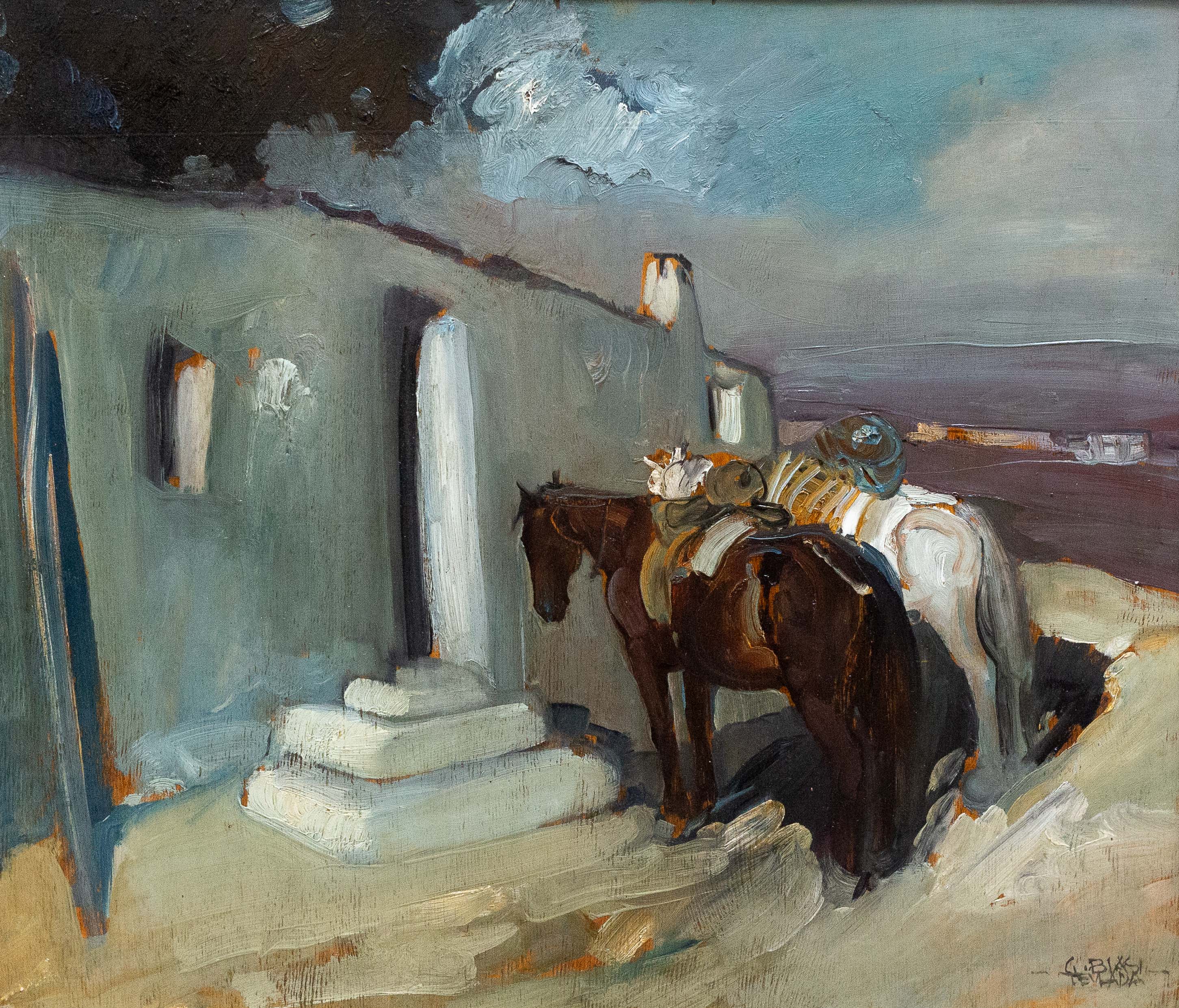 Bel dipinto del famoso pittore sardo Giuseppe Biasi, raffigurante splendido paesaggio rurale sardo con cavalli a riposo.