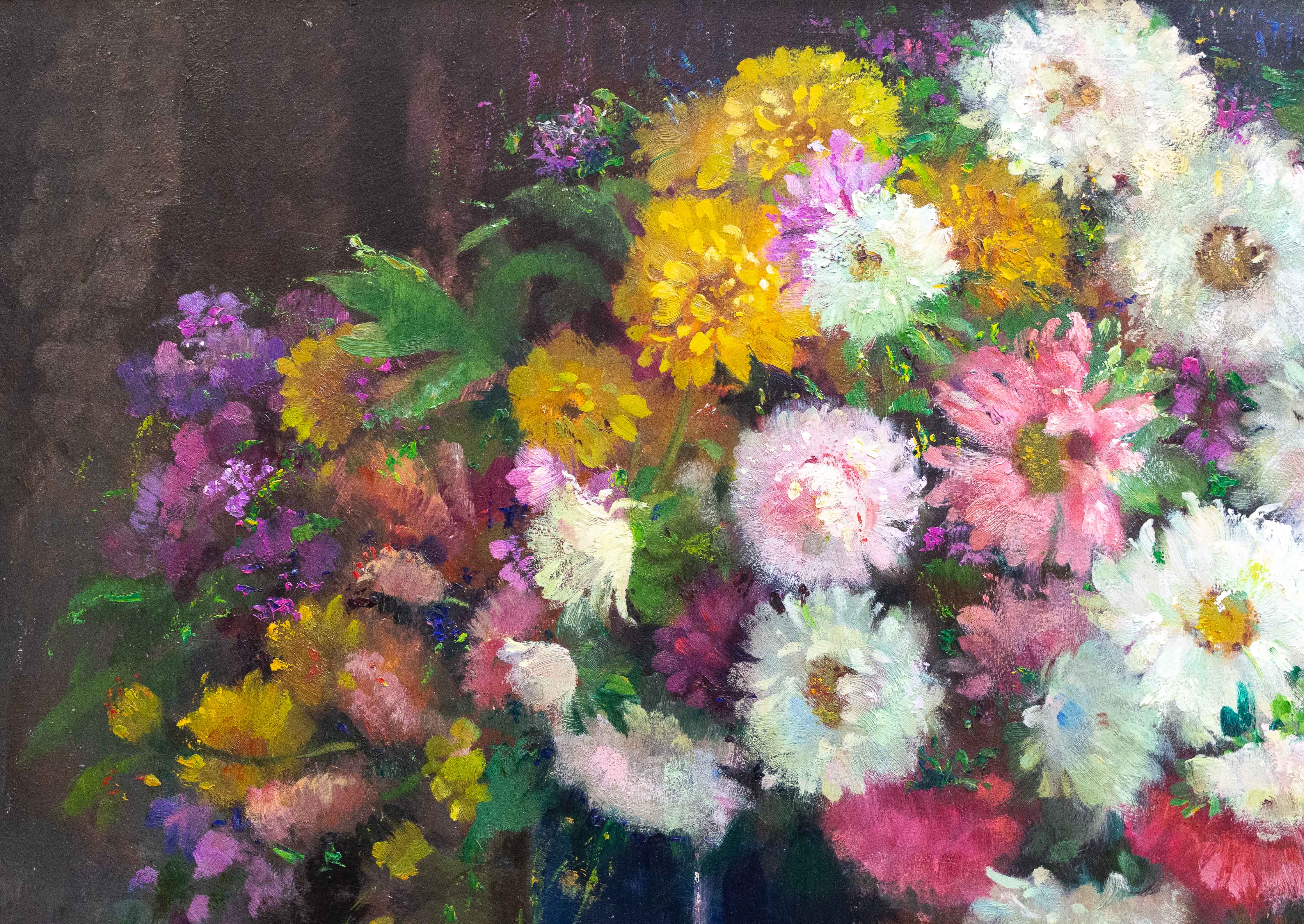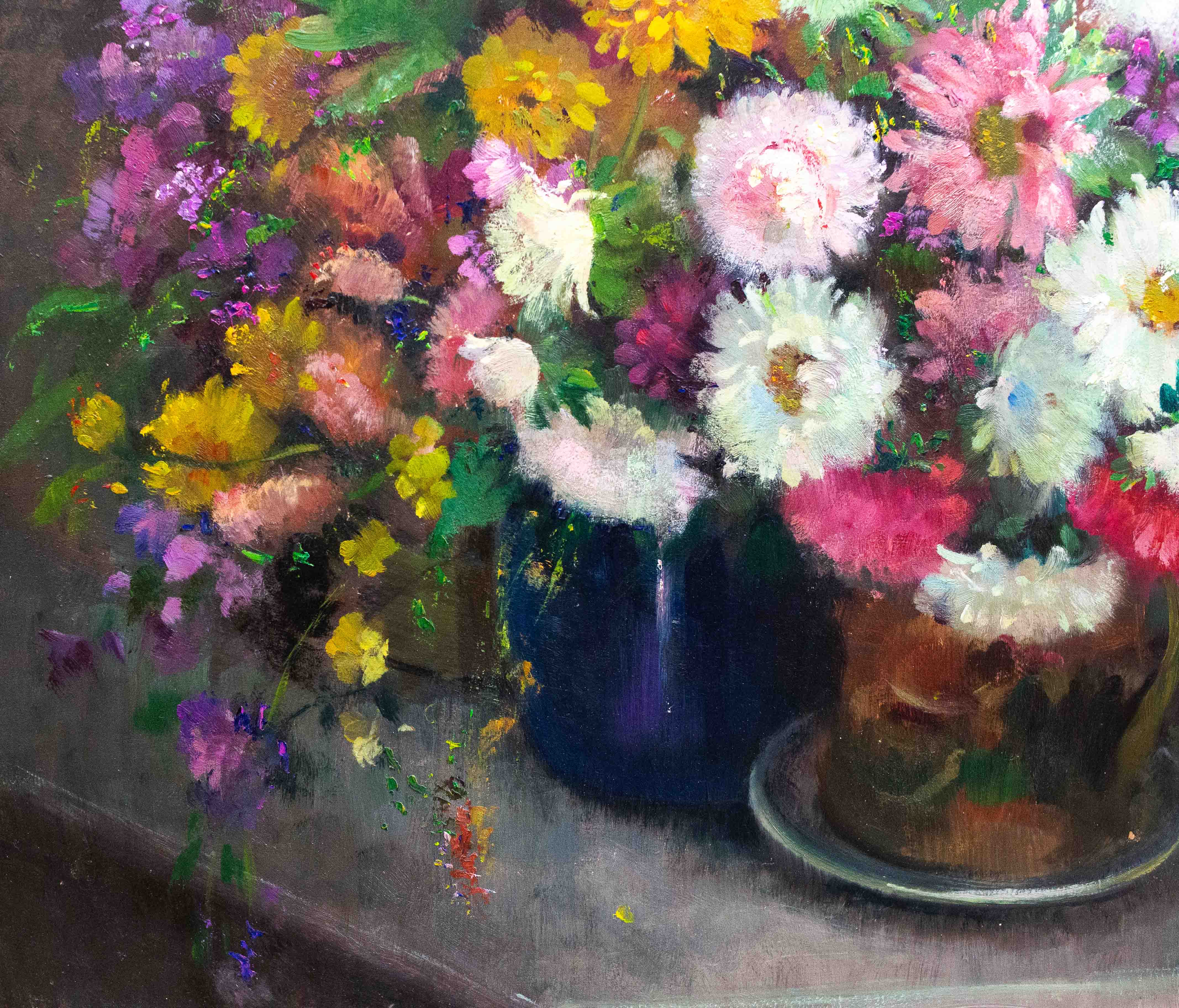 Bel dipinto del famoso pittore piemontese Giuseppe Sobrile, raffigurante vasi di fiori recisi su tavola con specchio.