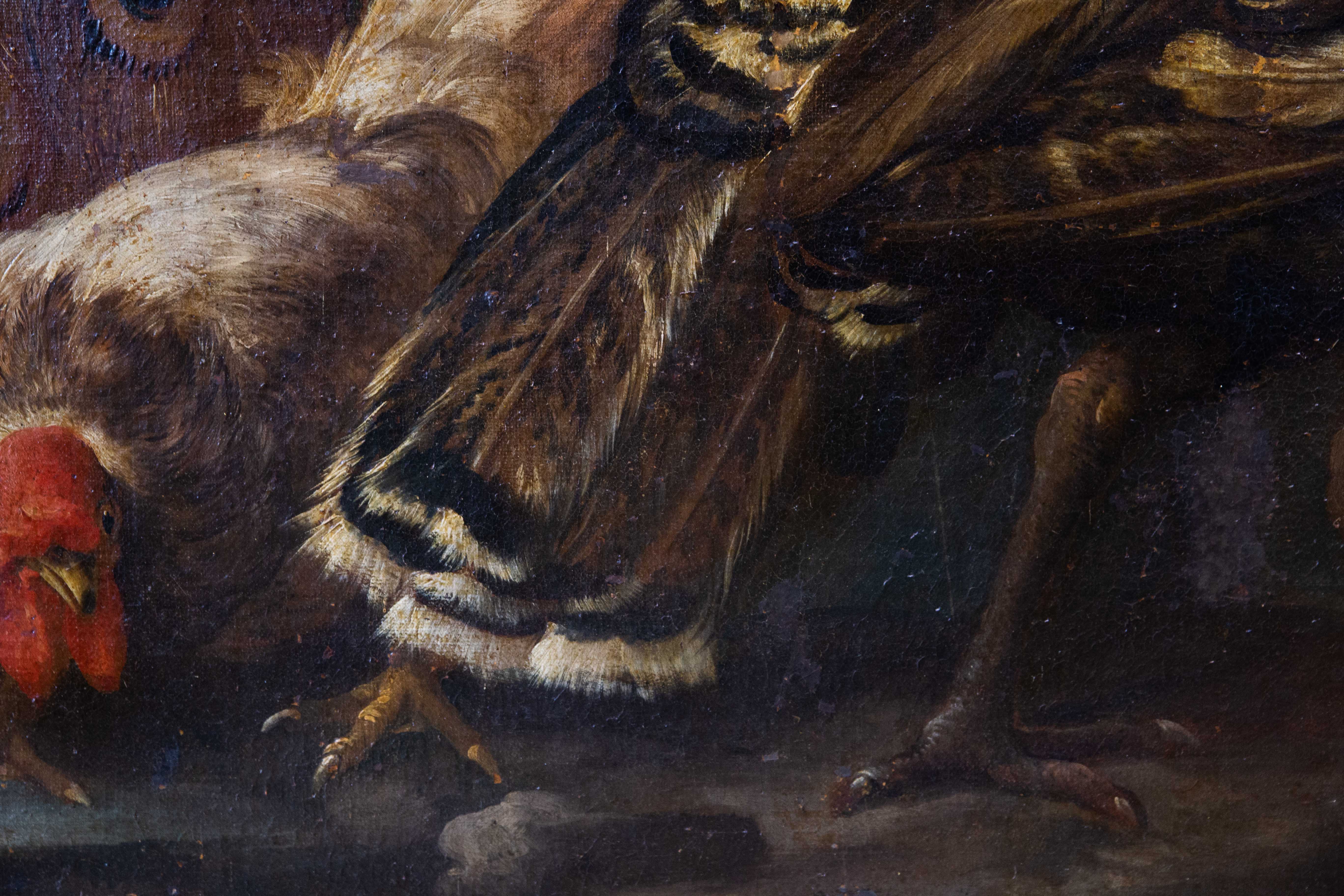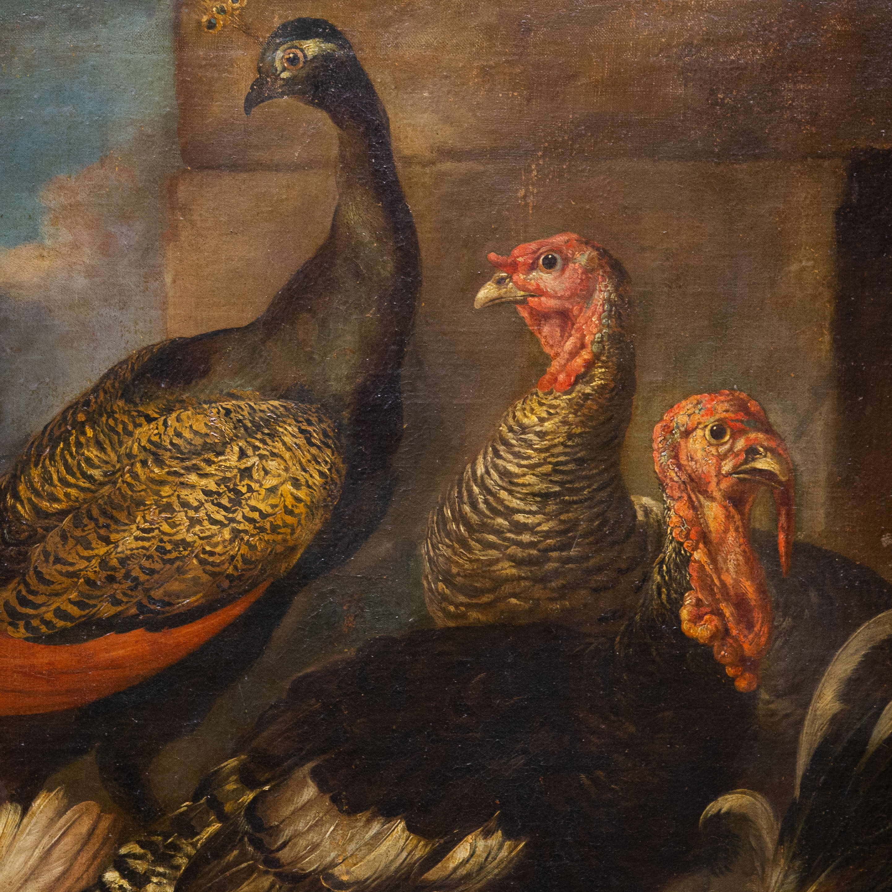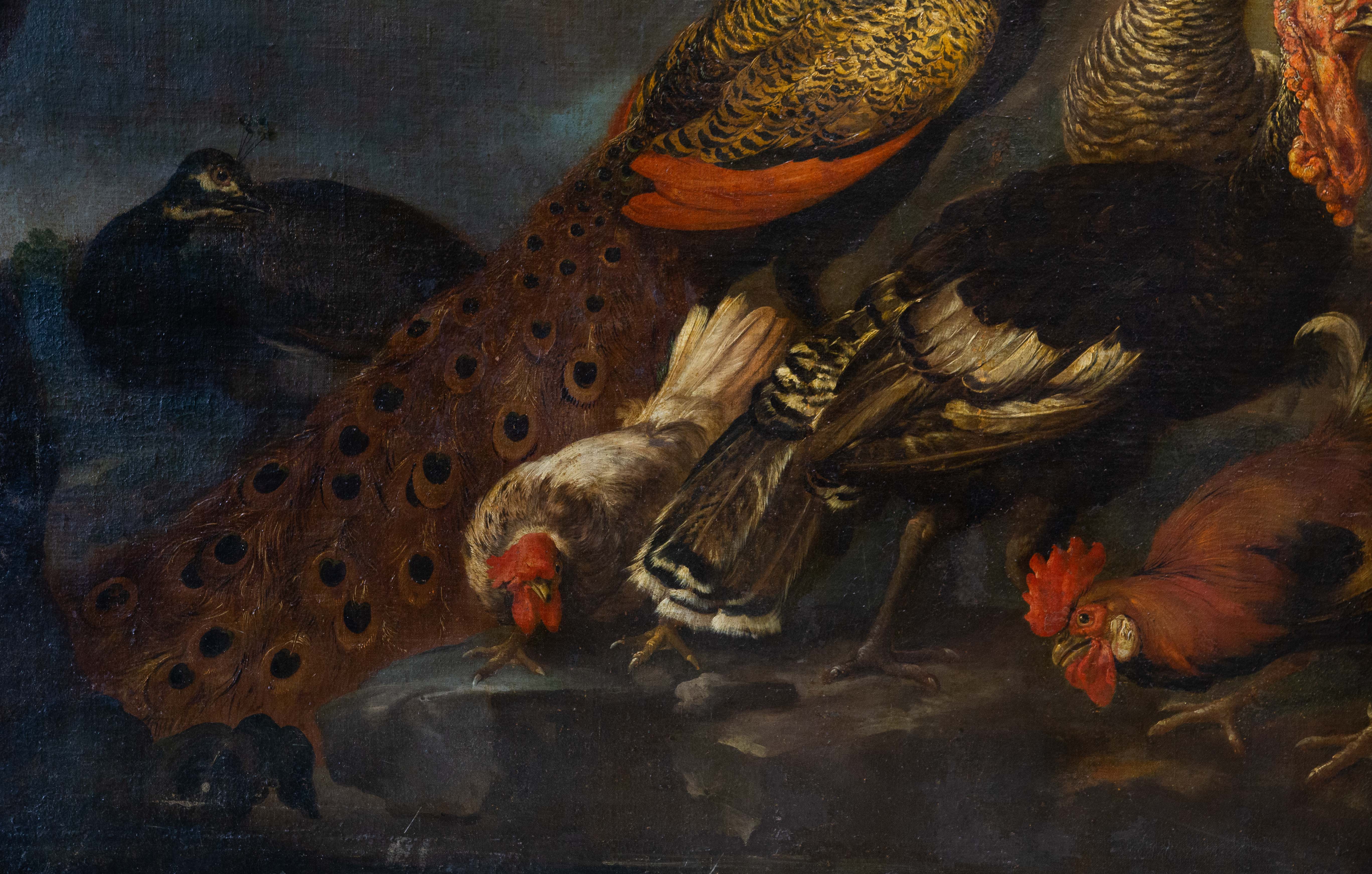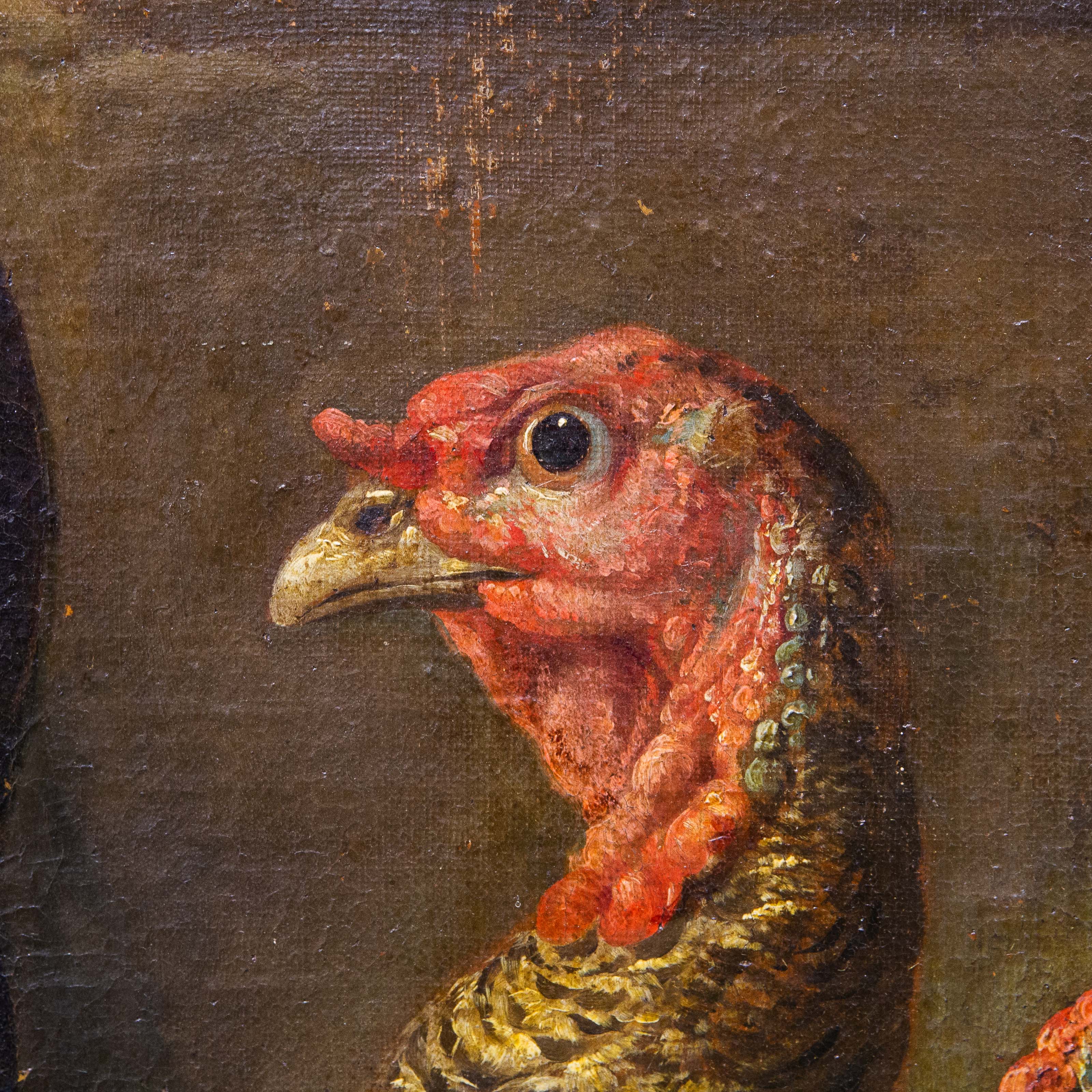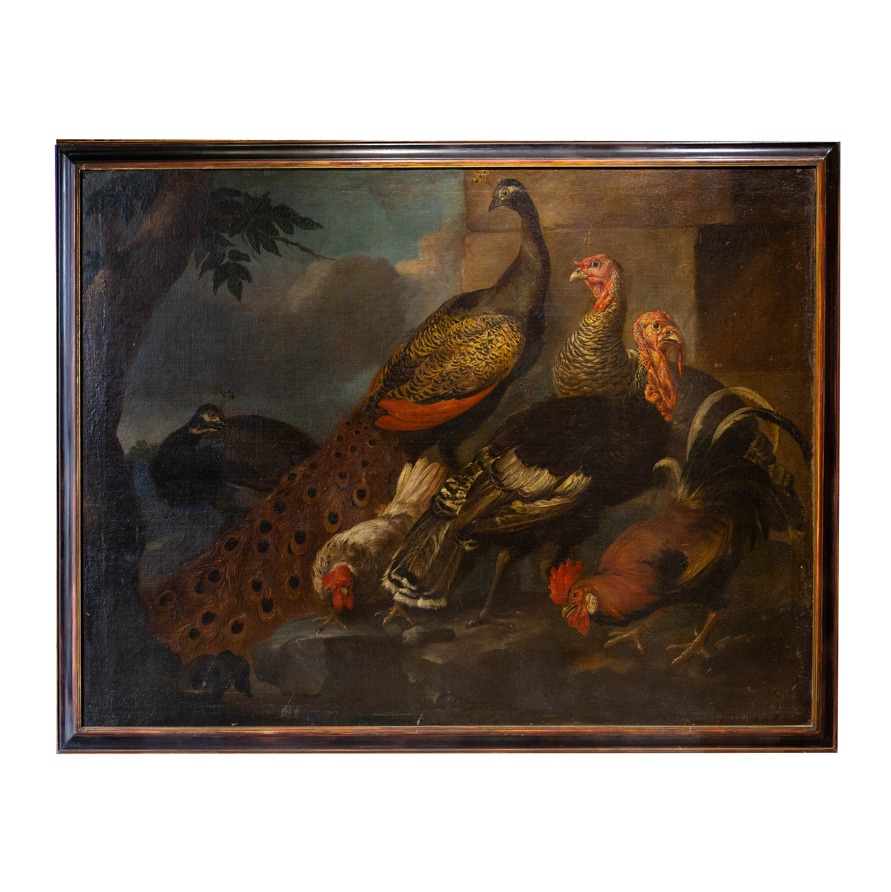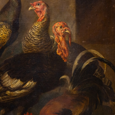 La scena si sviluppa con un’impostazione teatrale: un gruppo di animali da cortile – pavoni, tacchini e galli – è disposto secondo un calibrato equilibrio compositivo, emergendo da un fondale scuro e atmosferico. Il maestoso pavone domina la composizione con la sua coda punteggiata e iridescente, affiancato da tacchini dalle vivaci caruncole rosse e da galli dal piumaggio brillante, resi con straordinaria attenzione naturalistica.